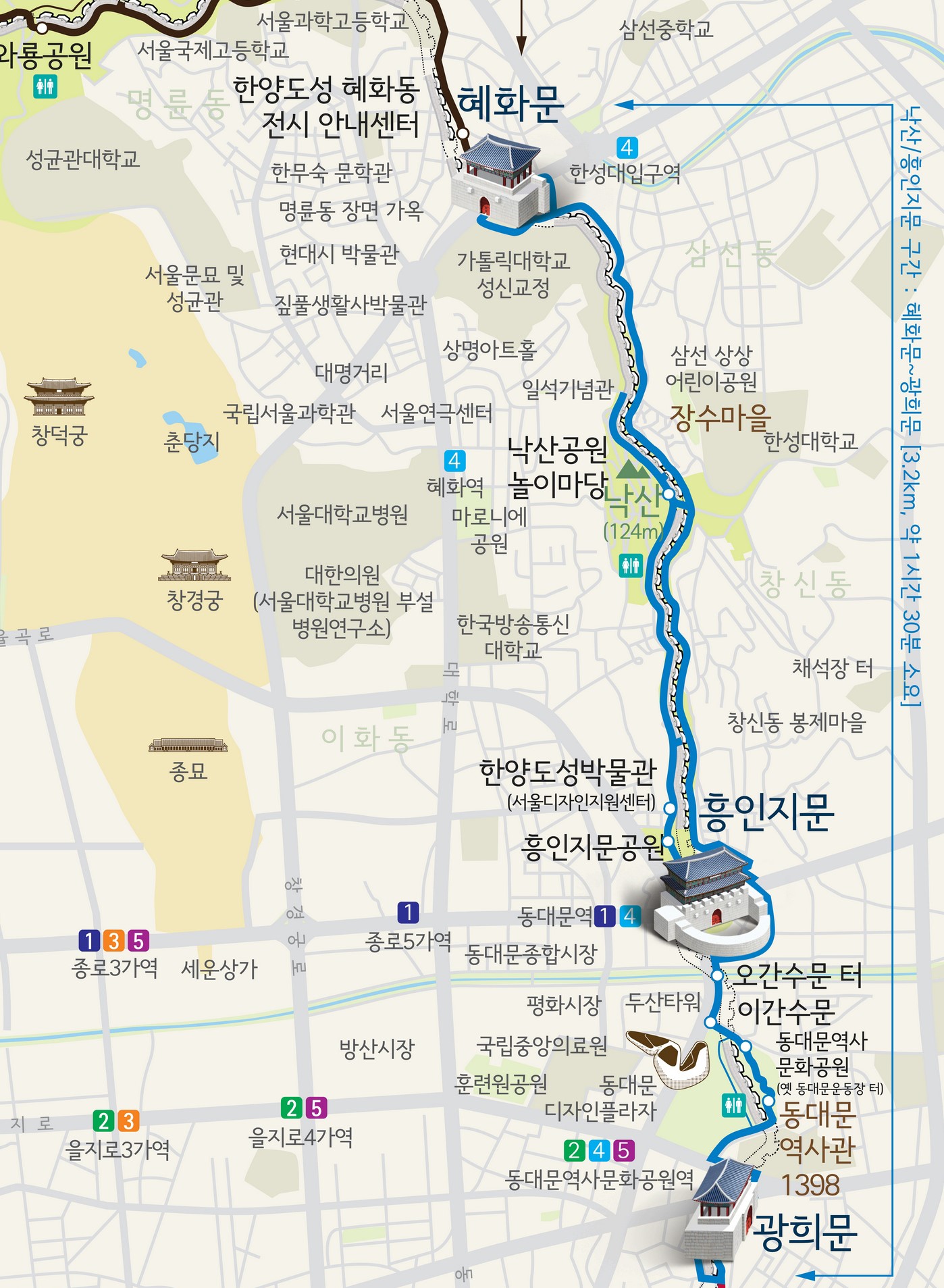 ■ 혜화문-한성대입구역 4번 출구- 나무계단-가톨릭대학 뒷길-장수마을-낙산공원 놀이마당-낙산정상-이화마을-한양도성박물관(서울디자인지원센터) -흥인지문공원-흥인지문