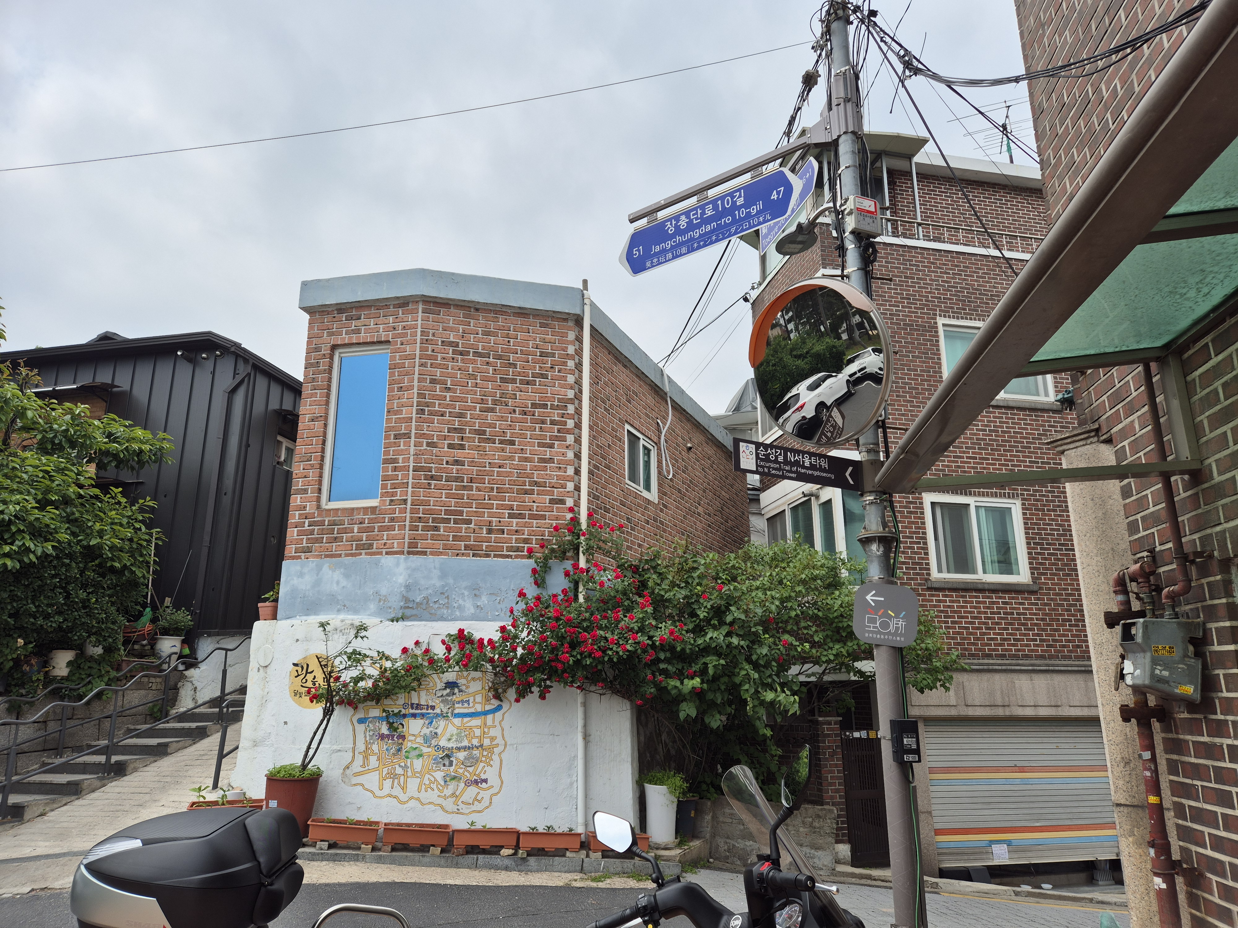 순성길 이화마을은 급경사 내리막길이다. 급경사 차도에 위태 위태 주차도 많이도 해 놓았다. 햔양도성과 함께 살아가는 이화마을 주민들이 부럽다.