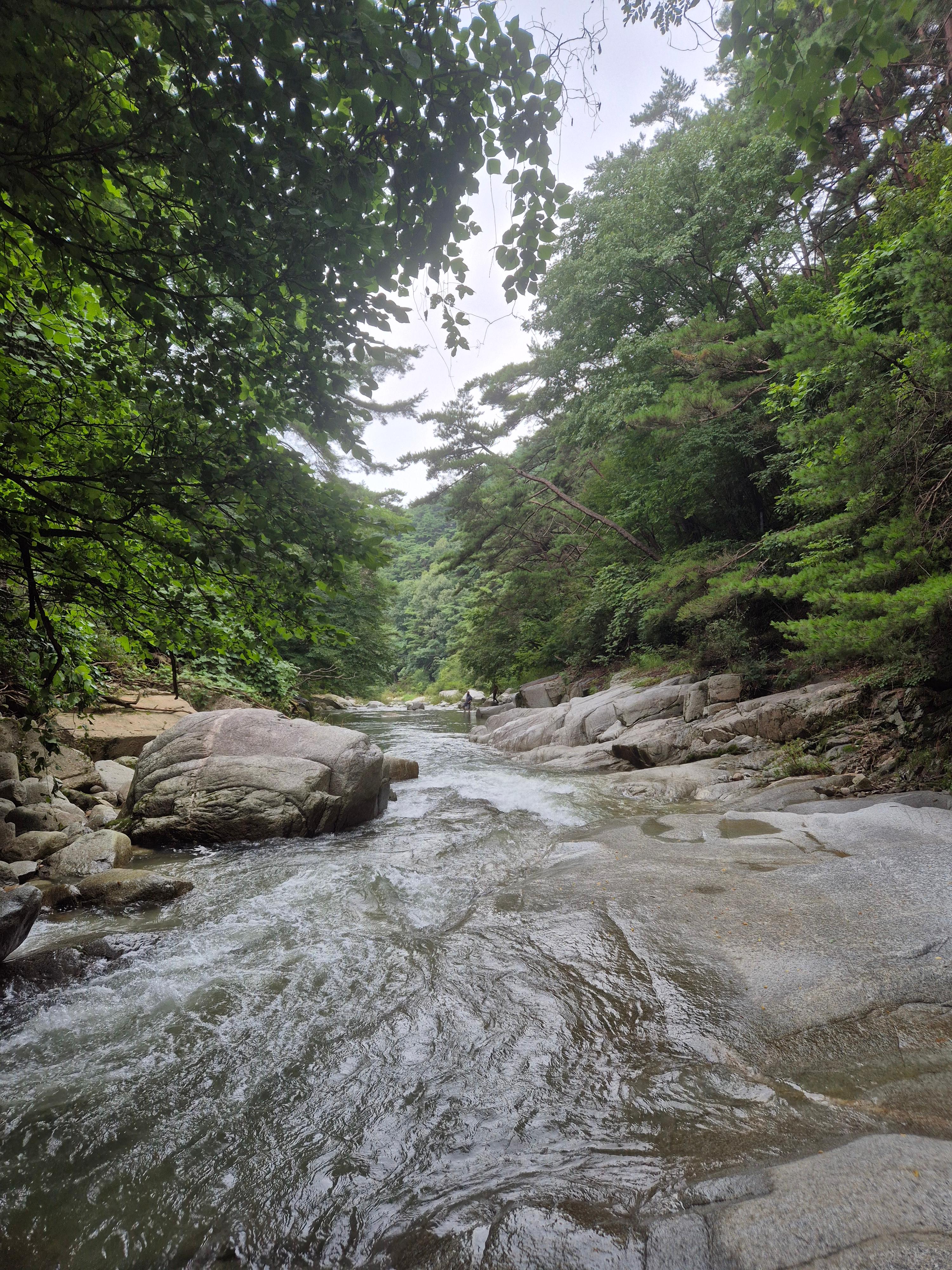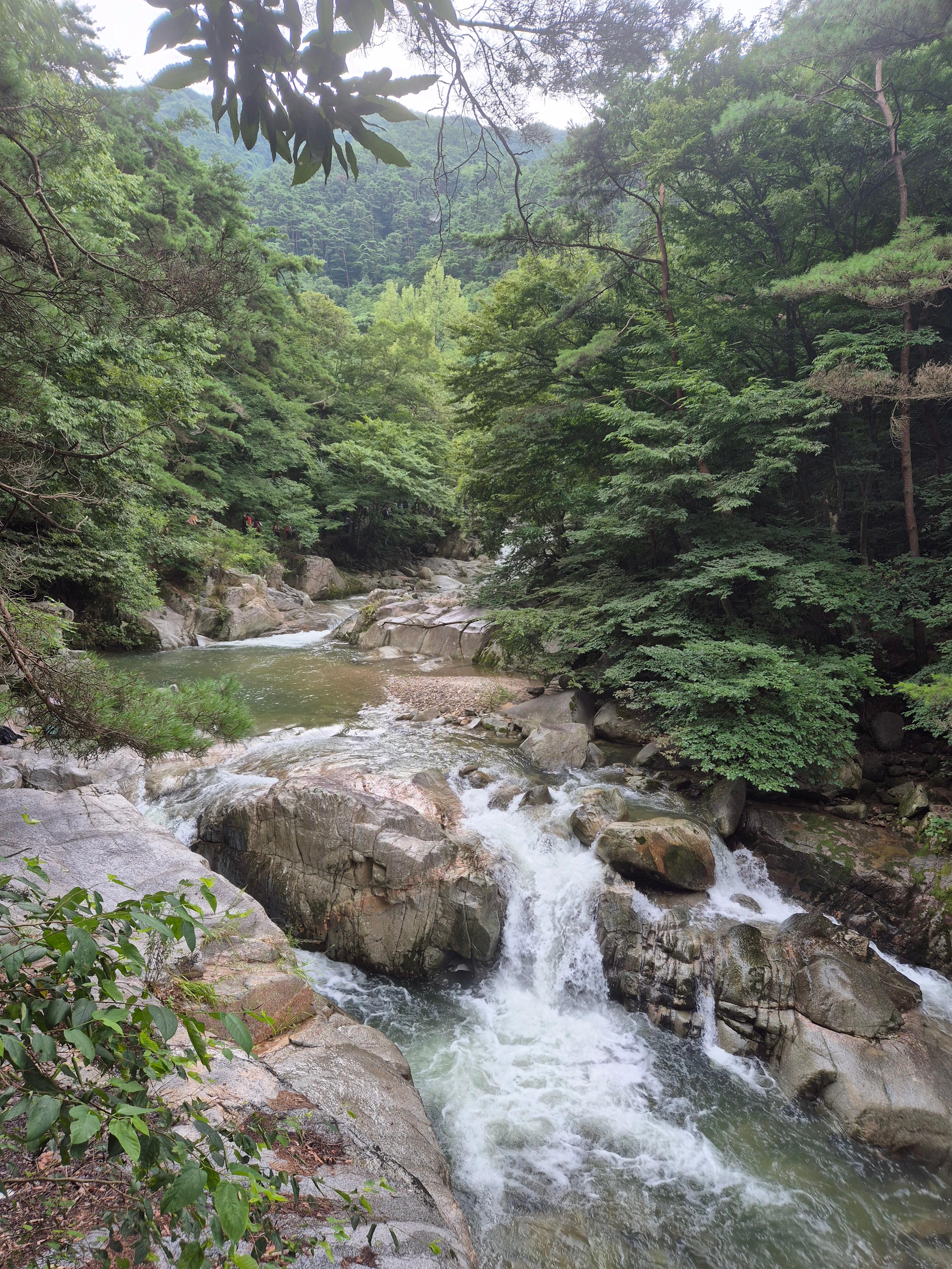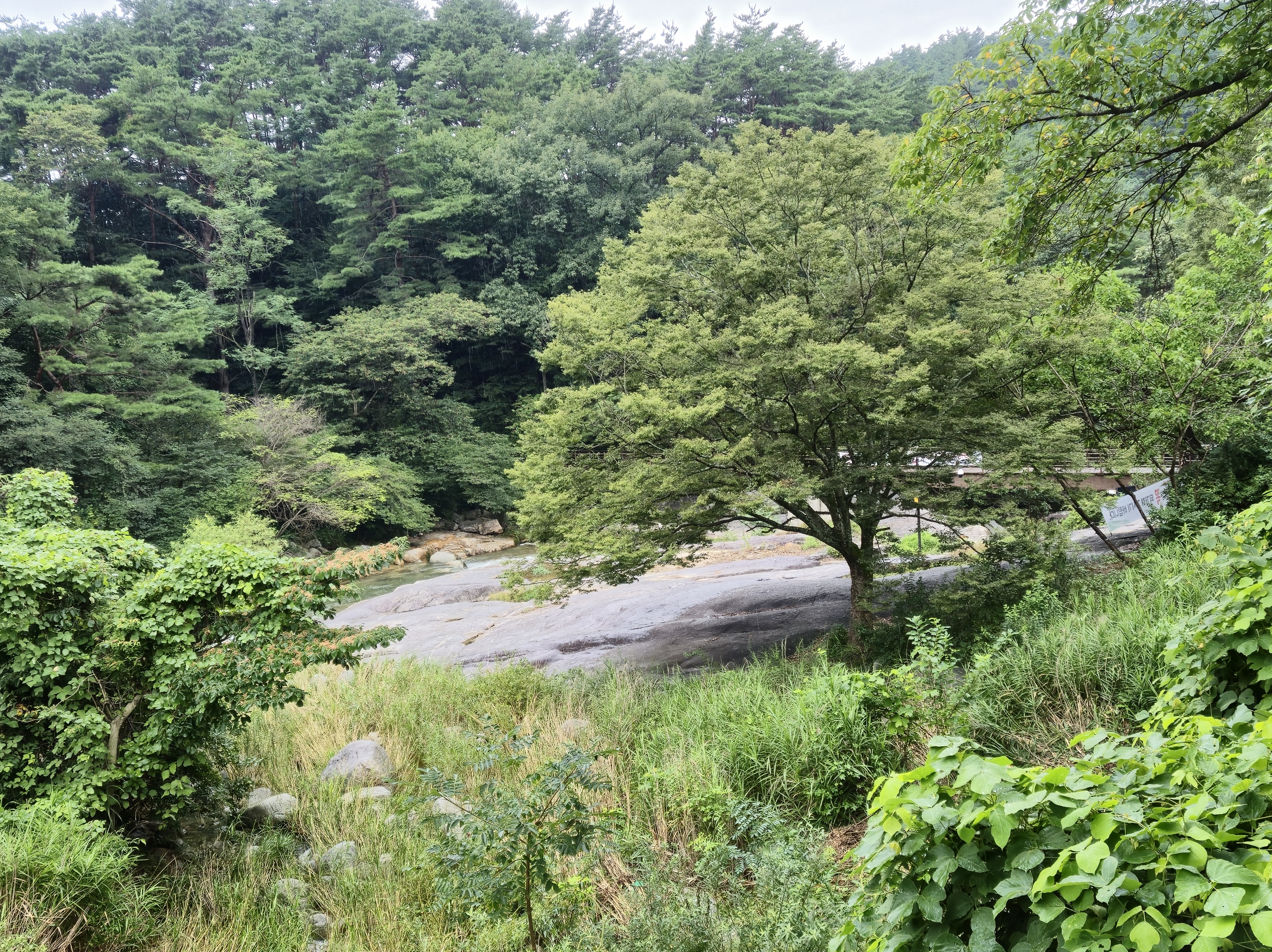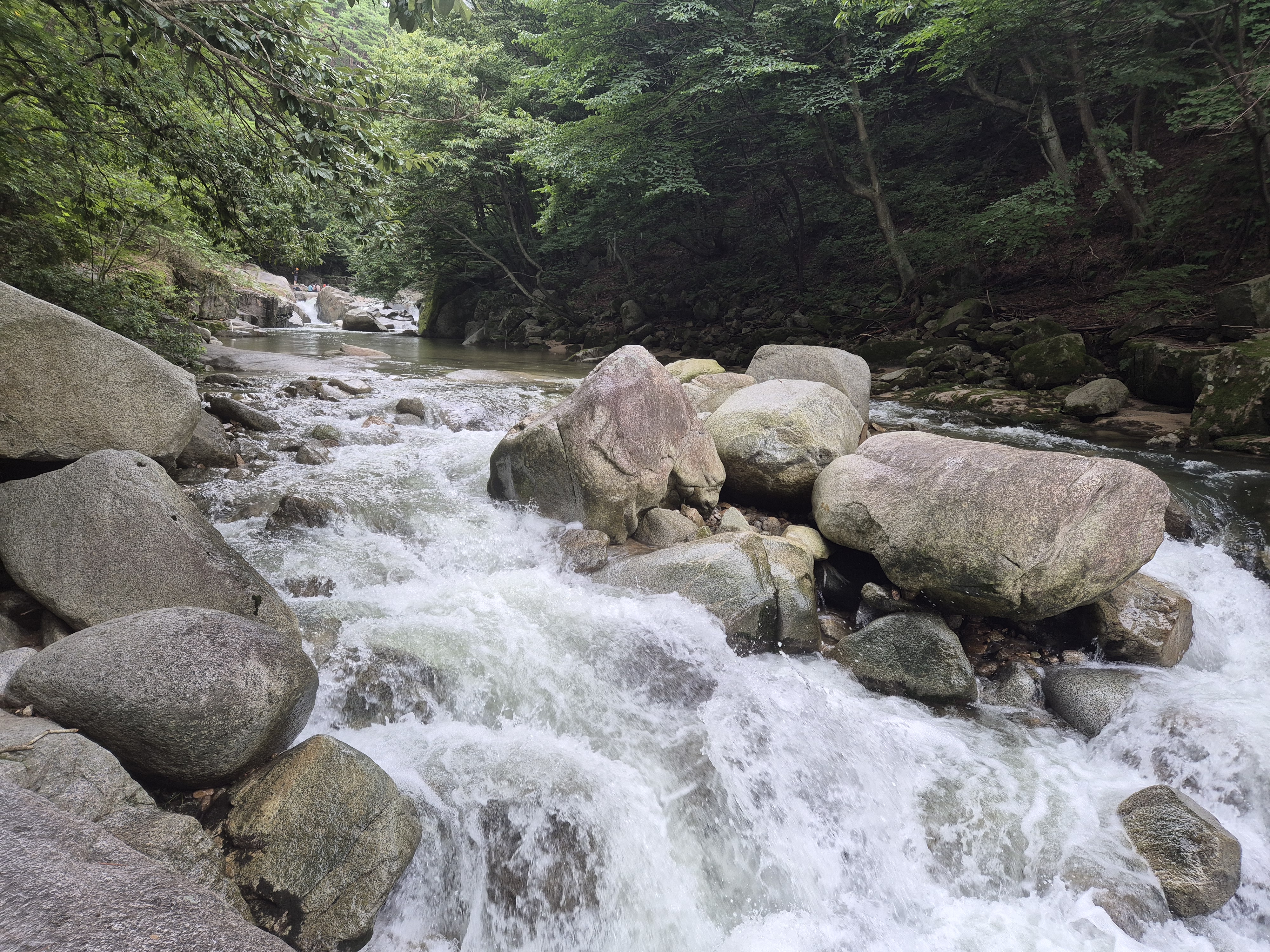 너른 암반 위를 흐르는 옥빛 청수가 바위틈을 거쳐 흰 거품을 품어내고 우렁찬 물소리 내며 힘차게 흐르고 있다. 요 근래 비가 많이 온 탓도 있지만 오늘따라 계곡물이 넘쳐흐른다.