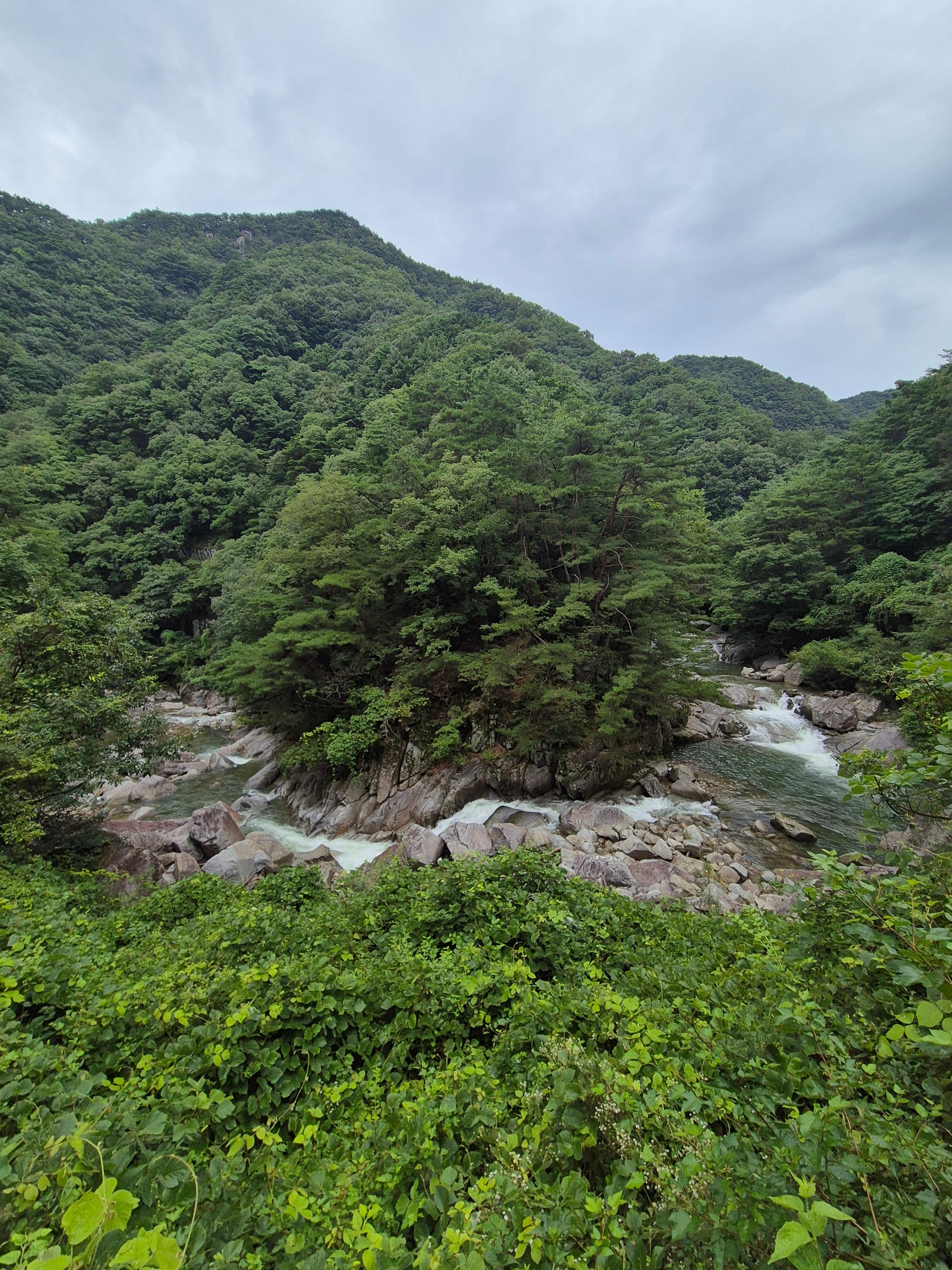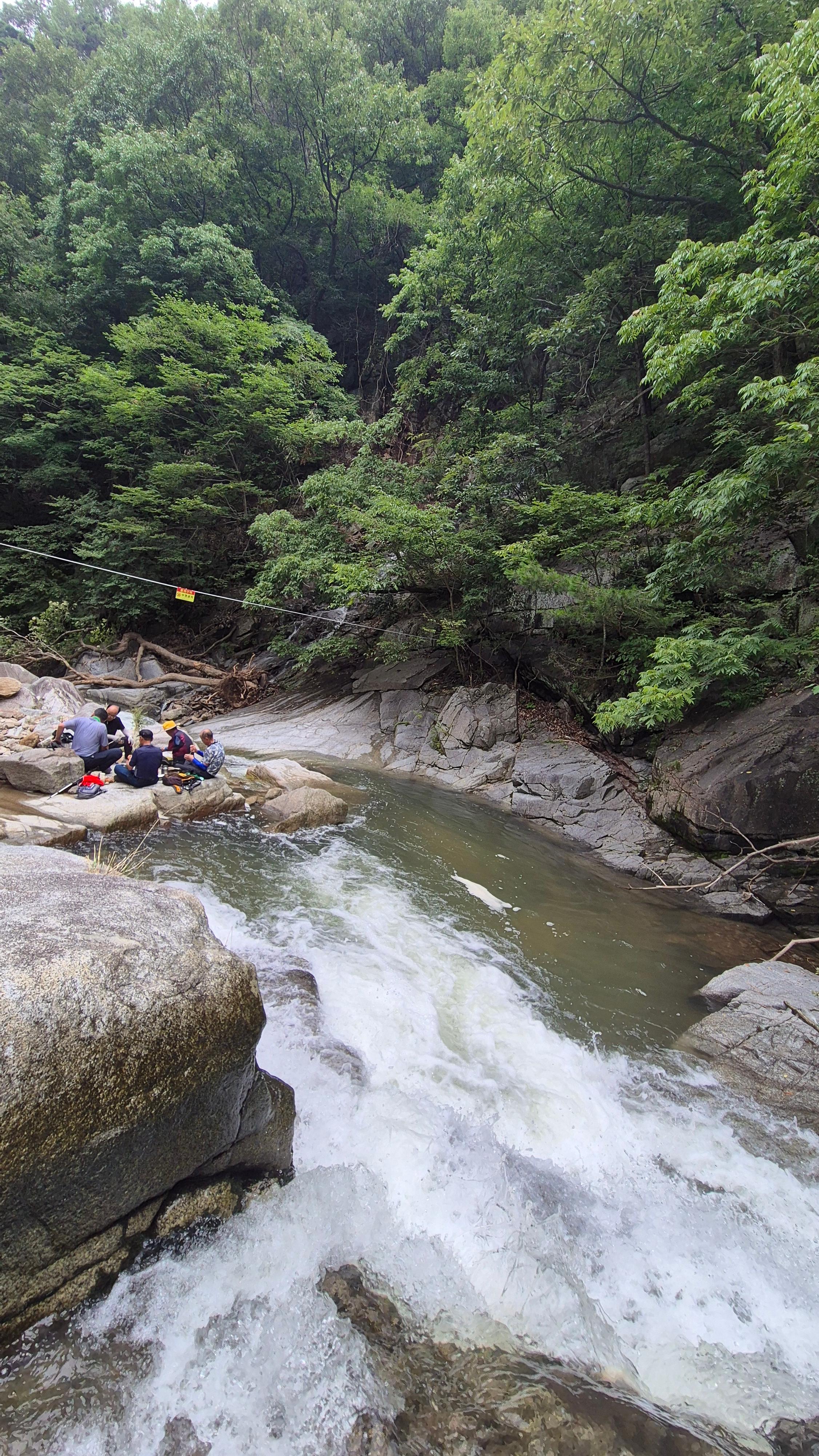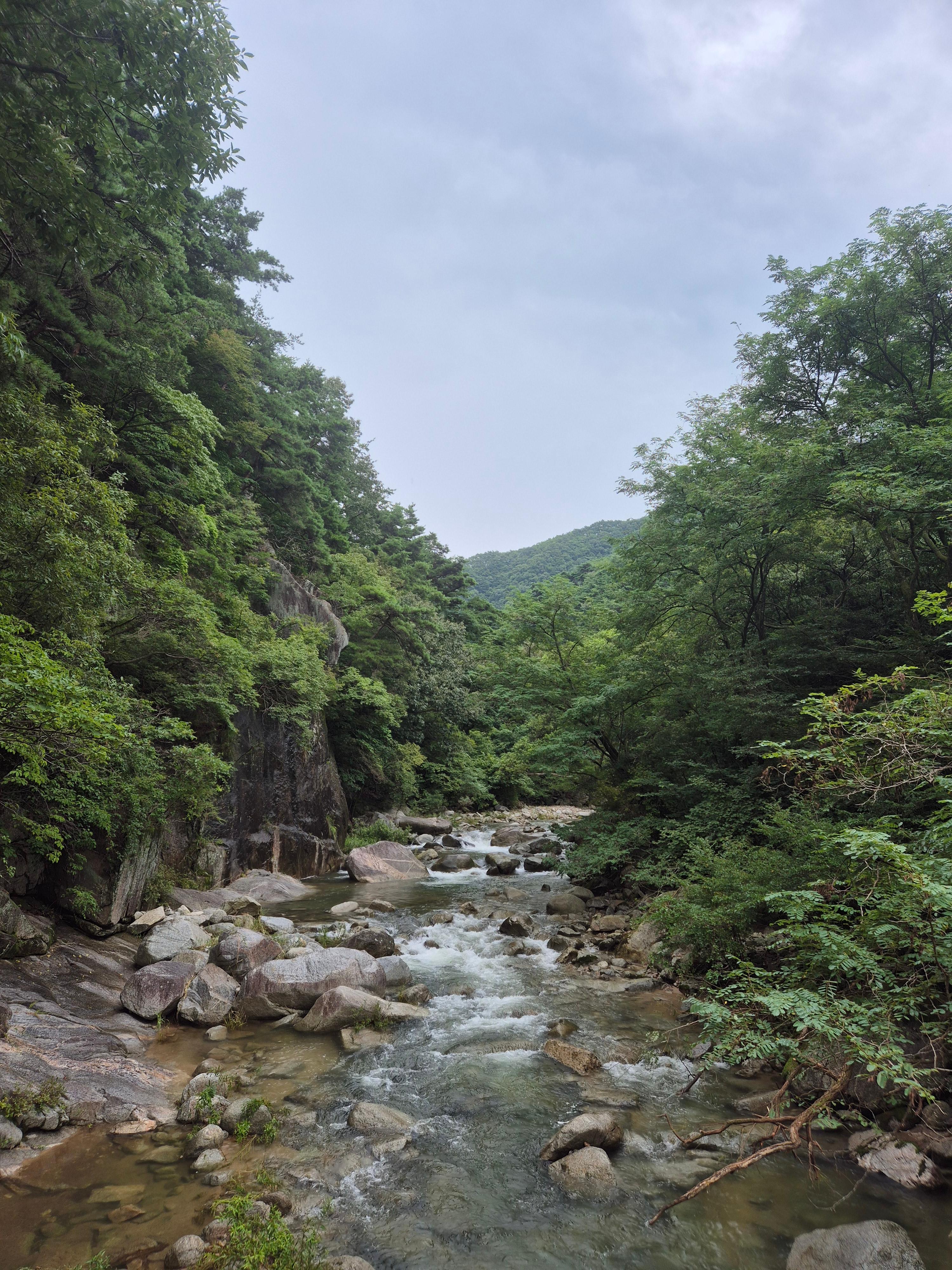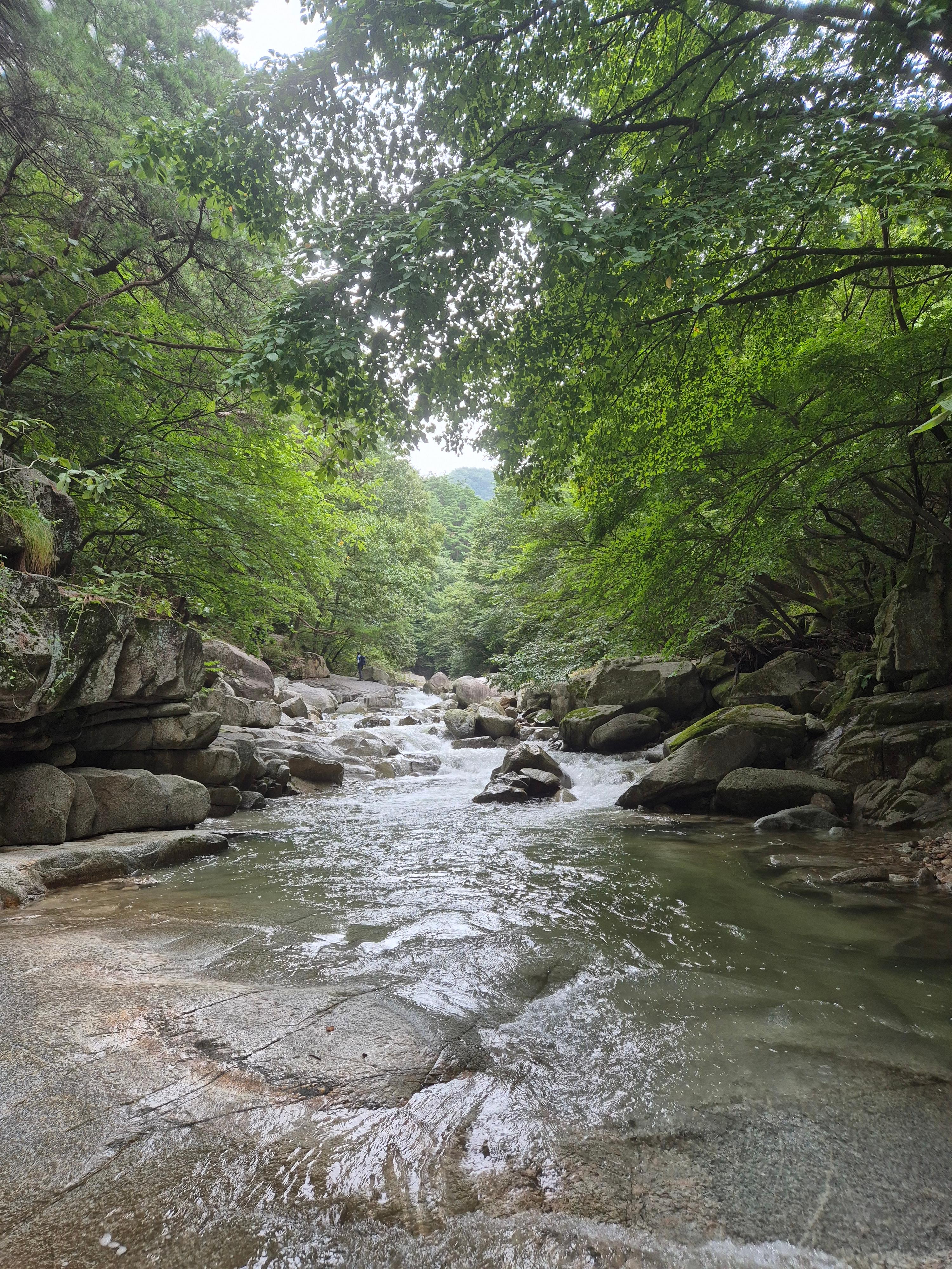 너른 암반 위를 흐르는 옥빛 청수가 바위틈을 거쳐 흰 거품을 품어내고 우렁찬 물소리 내며 힘차게 흐르고 있다. 요 근래 비가 많이 온 탓도 있지만 오늘따라 계곡물이 넘쳐흐른다.