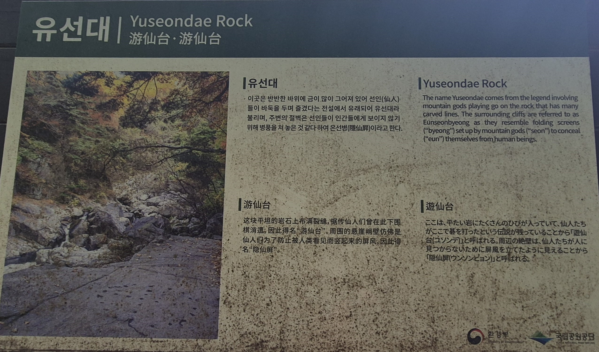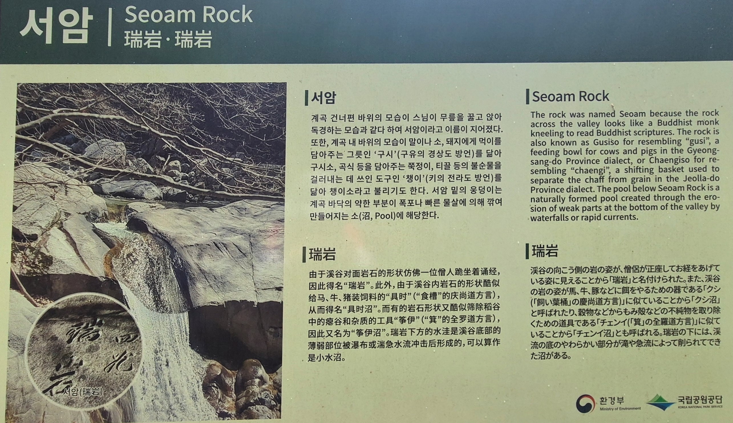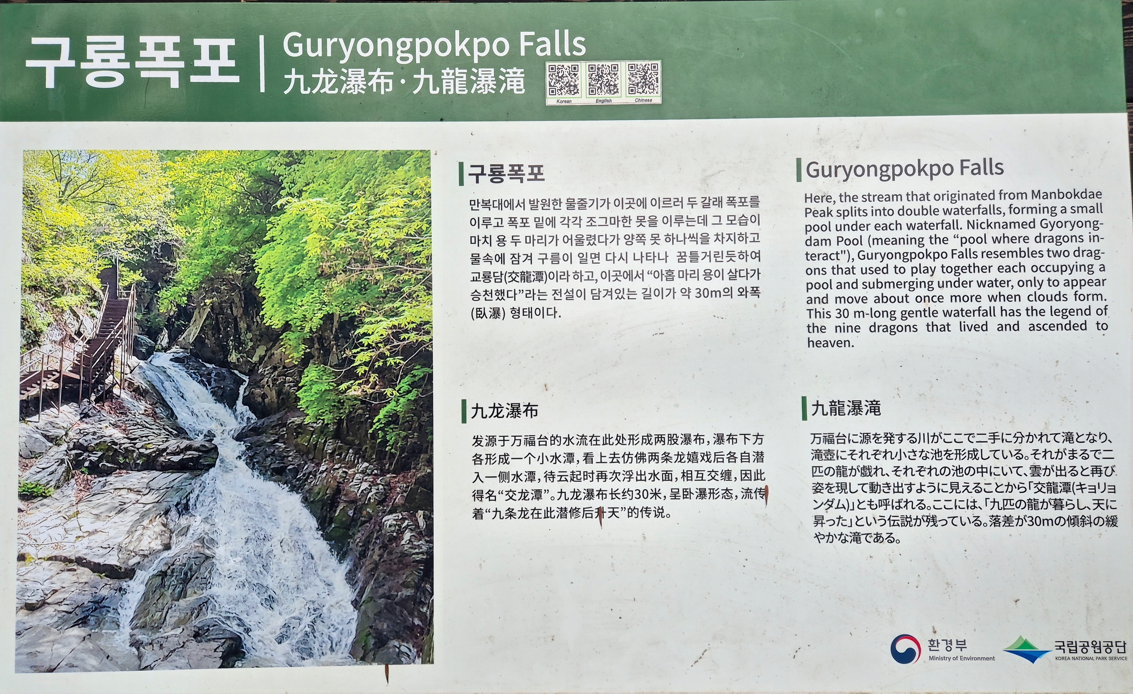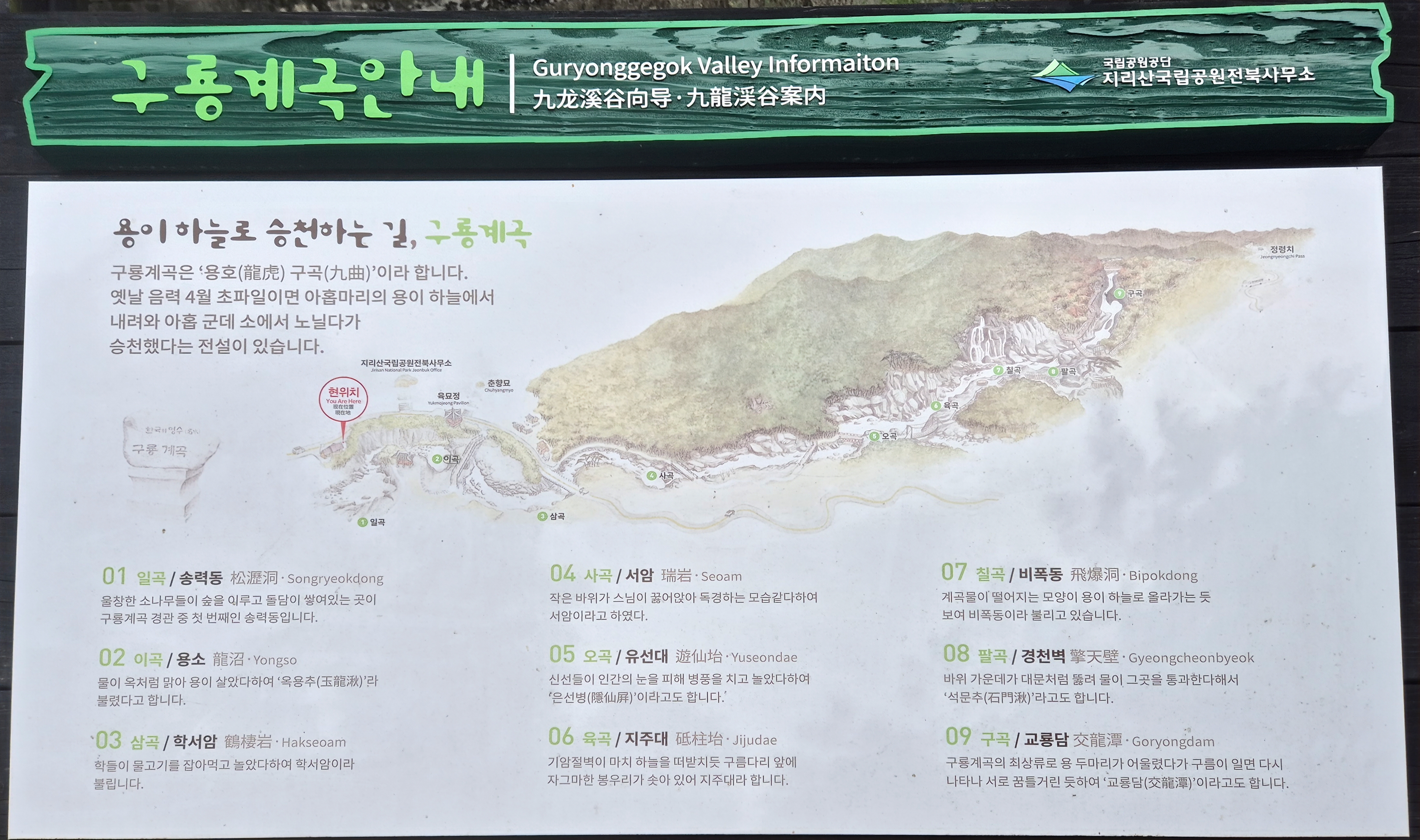 구룡계곡 안내를 들여다본다. 용이 하늘로 승천하는 길 구룡계곡은 '용호구곡"이라고 한다. 안내에는 호랑이 호자를 썼다. 그러나 이것은 잘 못이다. 호수 호자를 써야 함에도 호랑이 호자를 쓴 것은 무슨 이유일까? 구룡계곡을 용호계곡이라고 한 것은 용과 호수의 이야기이다. 국립공원은 잘 못된 안내를 바로 잡아야 할 것 같다.