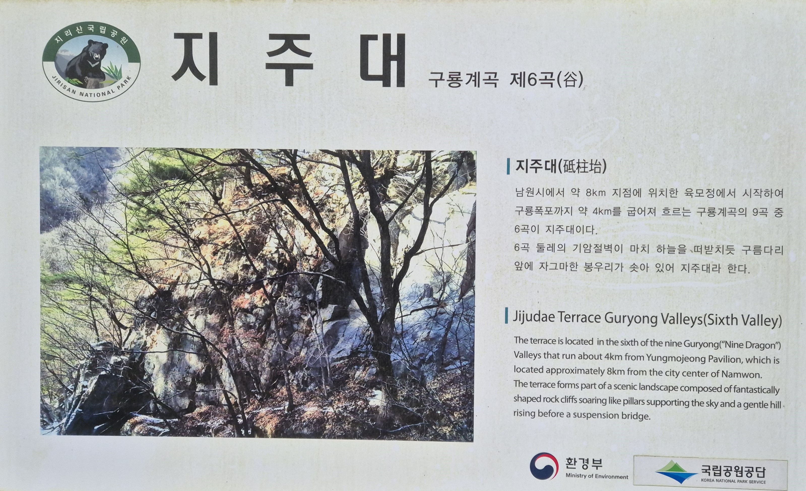 국가 산림문화자산 남원 구룡계곡 구룡폭 구곡 안내. 남원시와 전라북도, 산림청이 안내한 안내는 오래되어 많이 낡았다. 새로 고치던지 아니면 철거하는 것이 좋을 듯하다. 이렇게 방치하는 것은 아닌 것 같다.