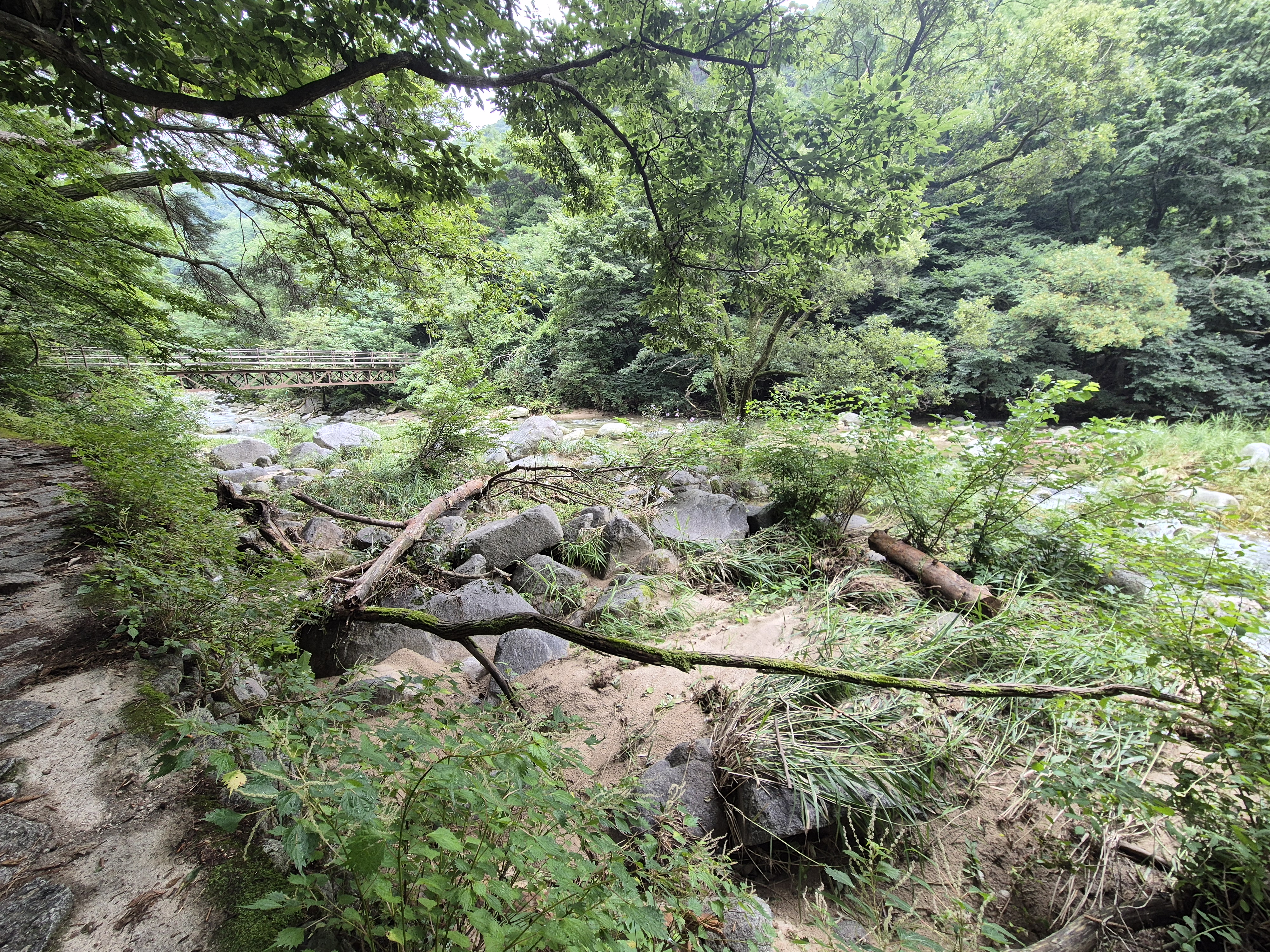 서암을 지나 조금 오르다 보면 지난 폭우로 계곡물이 넘쳐흘러 계곡을 할 거고 간 흔적이 역력하다. 많은 비가 내렸다.