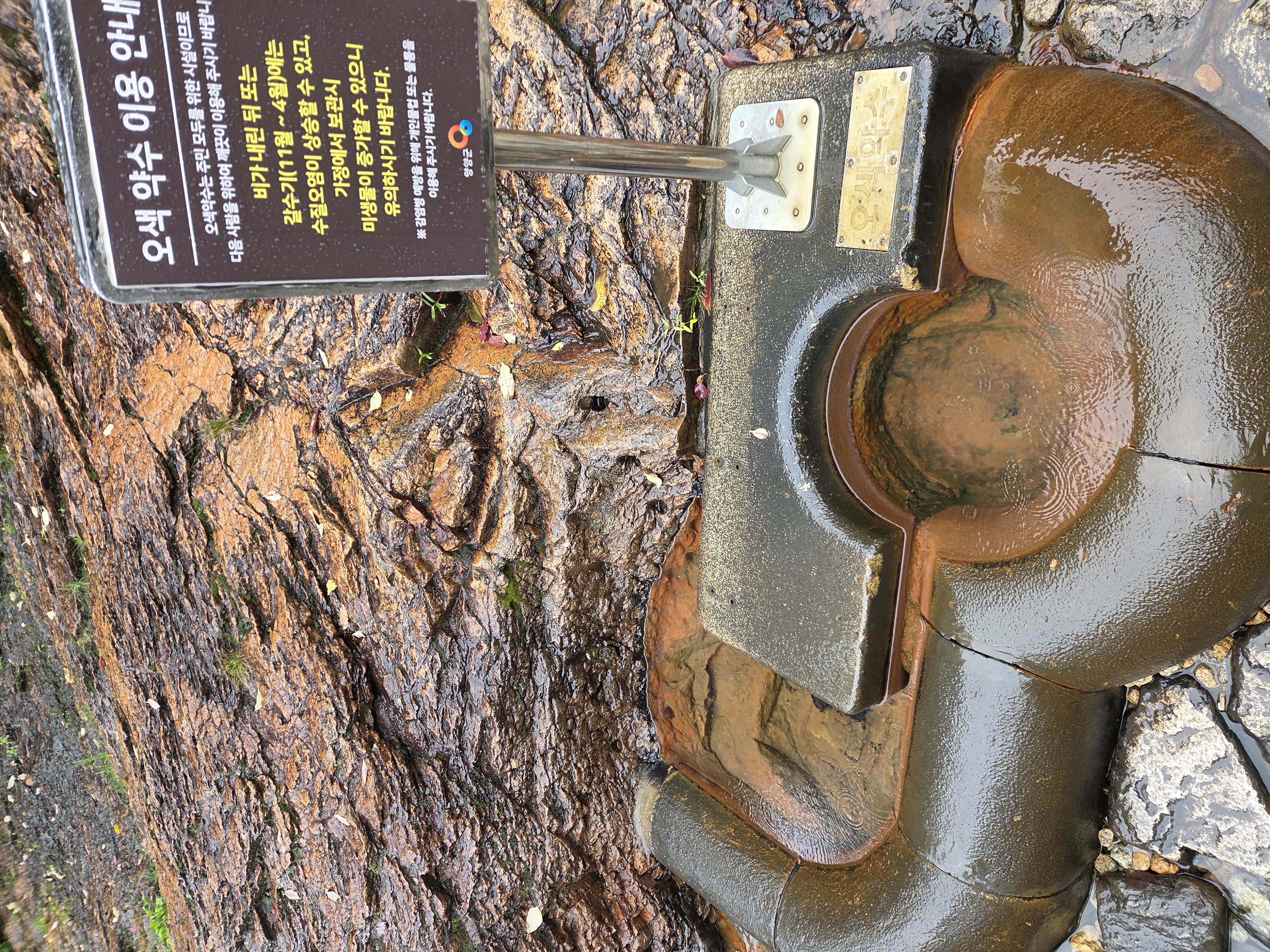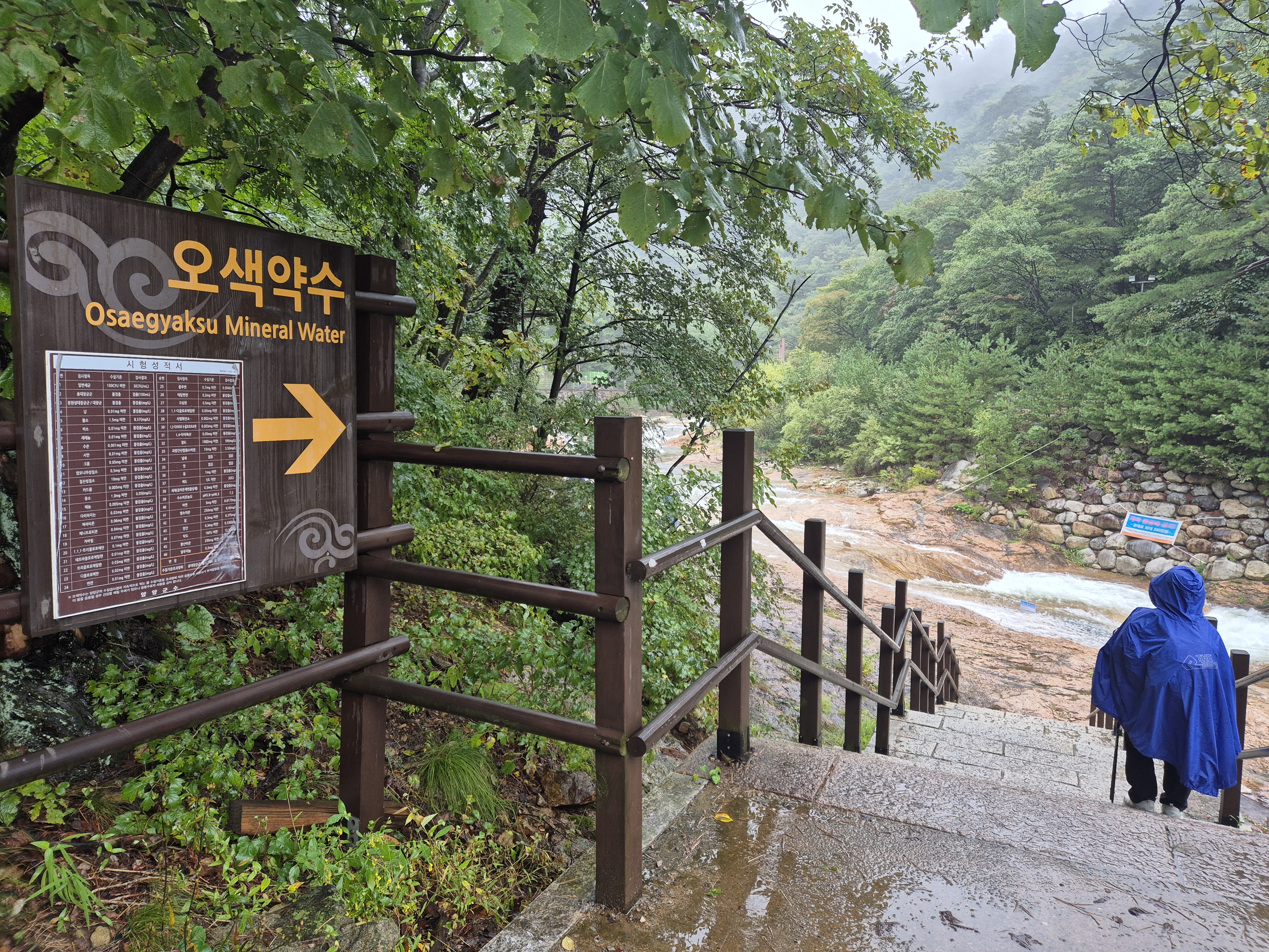 오색약수를 보았다. 계곡에 있는 오색약수는 철분이 들어있는 약수다. 백두대간과 낙동정맥을 타고 흐르는 산줄기에 약수가 많이 있다. 대부분 철분이 들어 있는 약수이다. 약수라고 하지만 얼마나 약이 될지는 미지수이다. 좀 색다른 철분 성분이 들어 있는 물이 나오기에 사람들은 이것을 몸에 좋다고 생각하고 약수라 한 모양이다.
