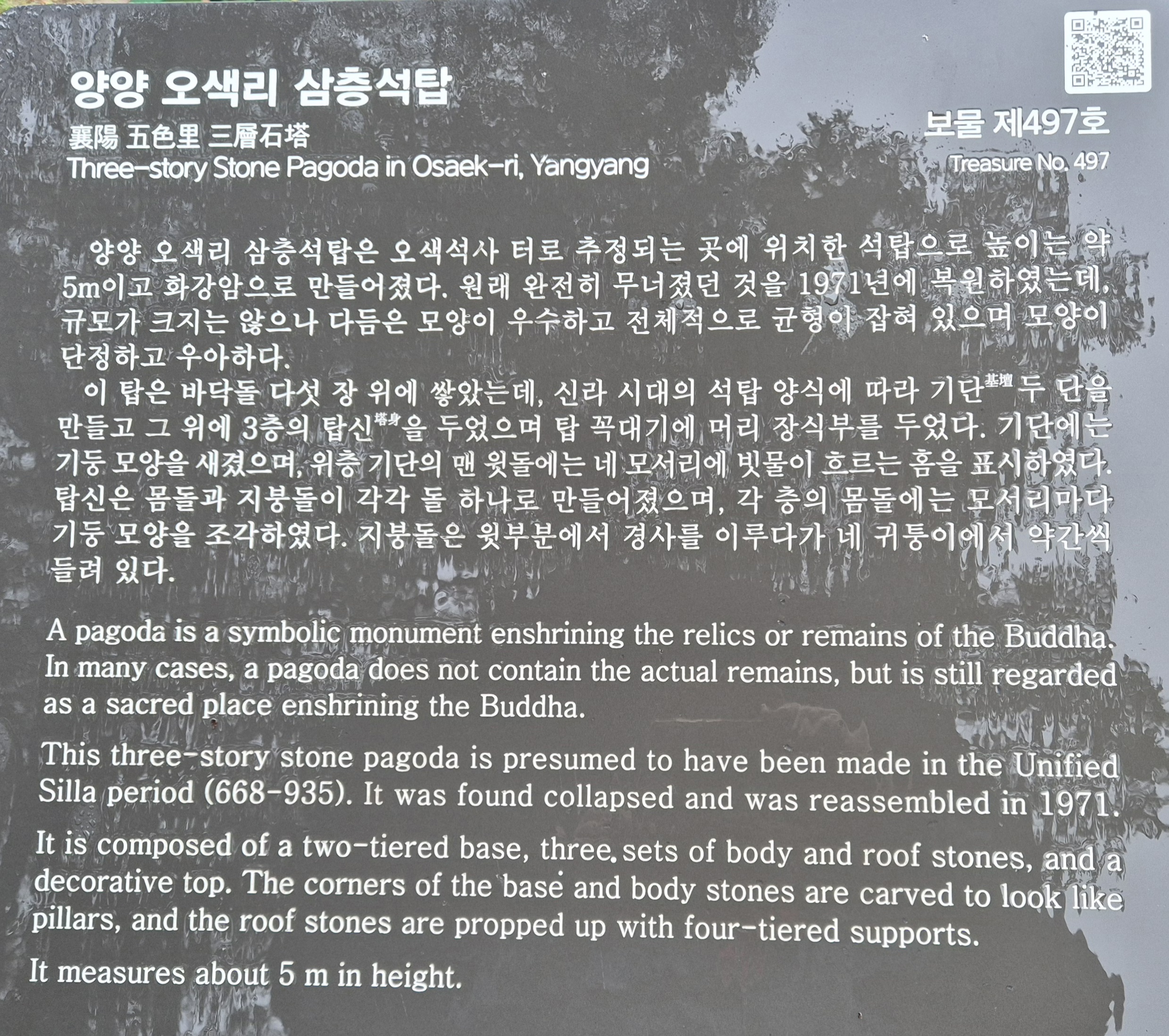 원래 오색석사(성국사) 3층석탑은 동탑과 서탑이 있었는데 서탑은 복원되고 동탑은 그 폐조각만 추슬러 3층 석탑 주변에 쌓아 놓았다. 어떤 정신 나간 스님에 의해 폐사된 후 오랫동안 방치 되었다가 1971년에 복원하면서 이렇게 동탑은 서탑을 바라보고 있게 해 놓았다. 천년의 무심한 세월은 오늘도 흐르고 있으나 언젠가 큰 공덕이 있어 동탑도 그 화려했던 모습으로 돌아오길 간절히 바라본다.