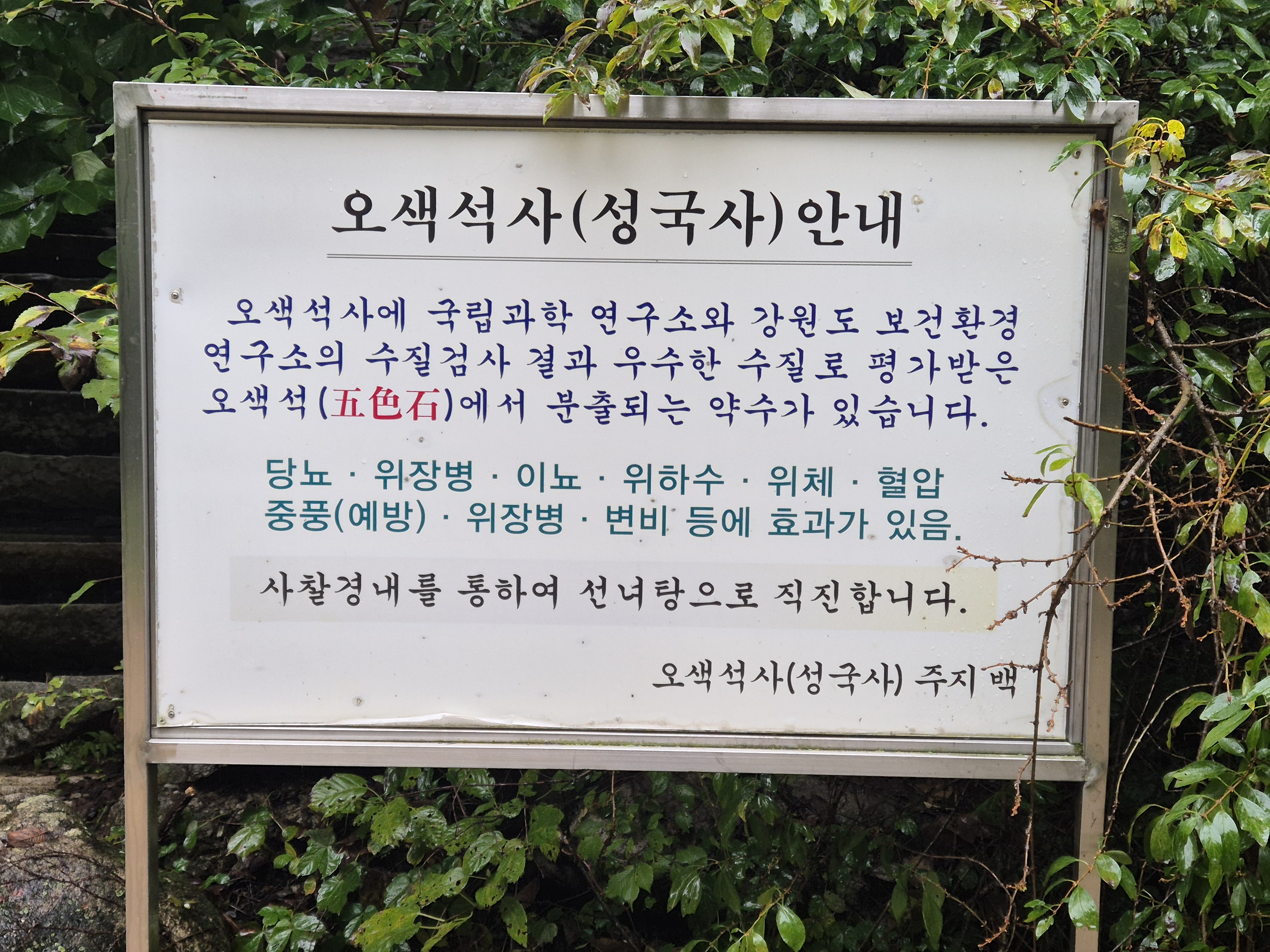아마 이 자리가 대웅전 자리였을까? 웅장했던 신라시대 화려함은 어디 가고 나전에 저렇게 삼존불이 비를 맞고 있으니 참으로 맘이 아프다. 부처님이야 비를 맞든 대웅전에 앉아 있든 어떤 탓도 하지 않겠지만 그래도 언젠가 큰 공덕이 있어 원래의 대웅전 안에 모시길 간절히 기도하며 성국사를 지난다. 주전골 선녀탕으로 가기 위해서는 오색석사(성국사)를 지나도록 되어 있다.