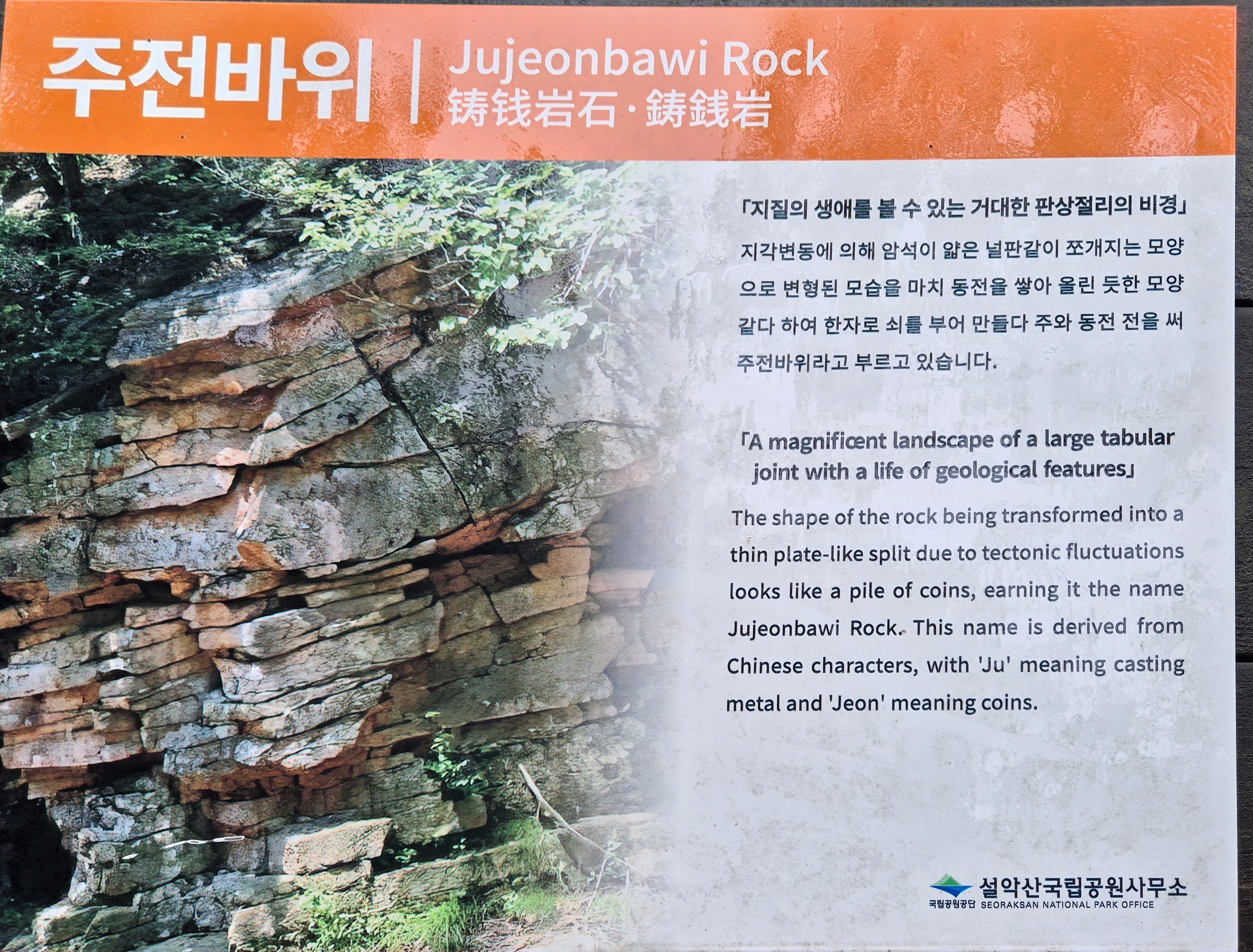 지각변동에 의해 암석이 얇은 널판같이 쪼개지는 모양으로 변형된 모습을 마치 동전을 쌓아 올린 듯한 모양 같다 하여 한자로 쇠를 부어 만들다 주와 동전 전을 써 주전바위라고 부른다.