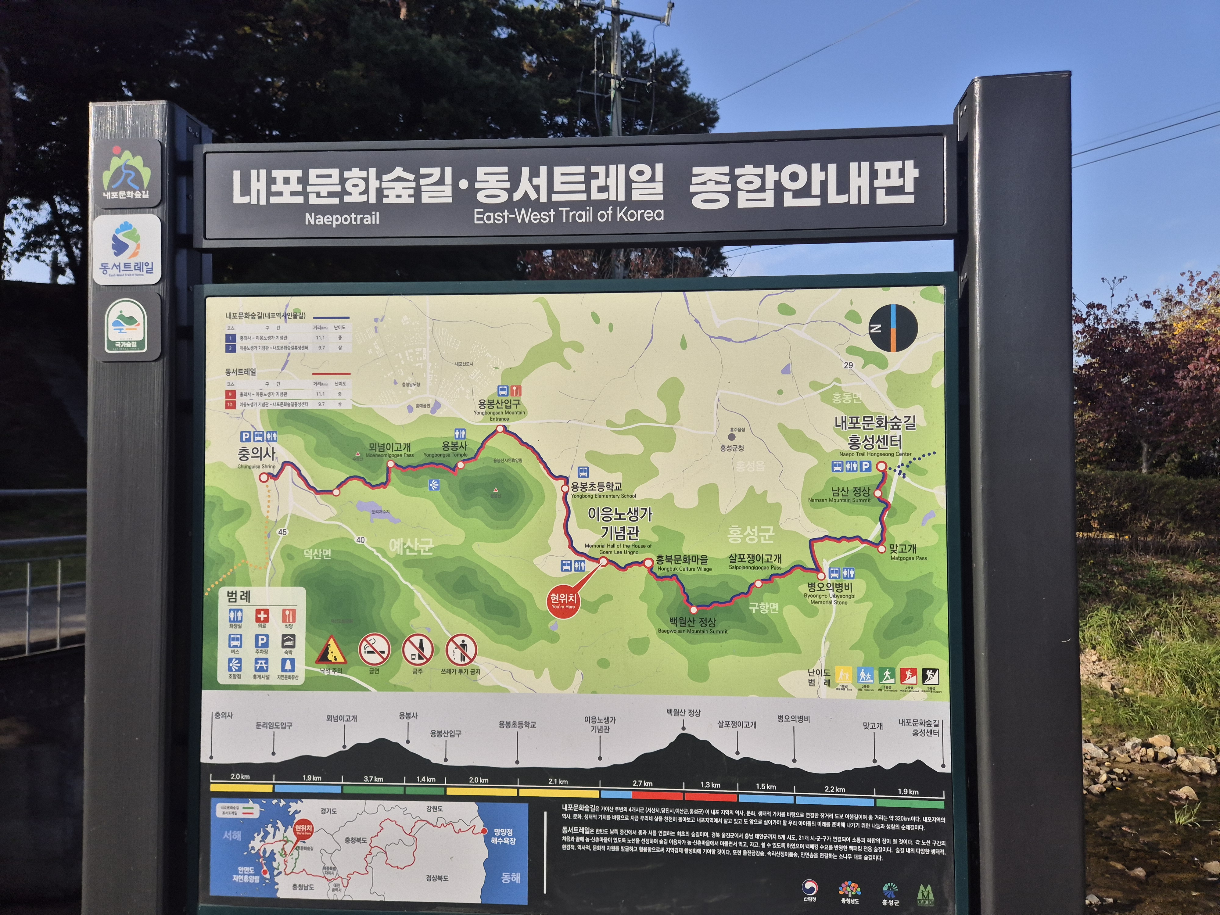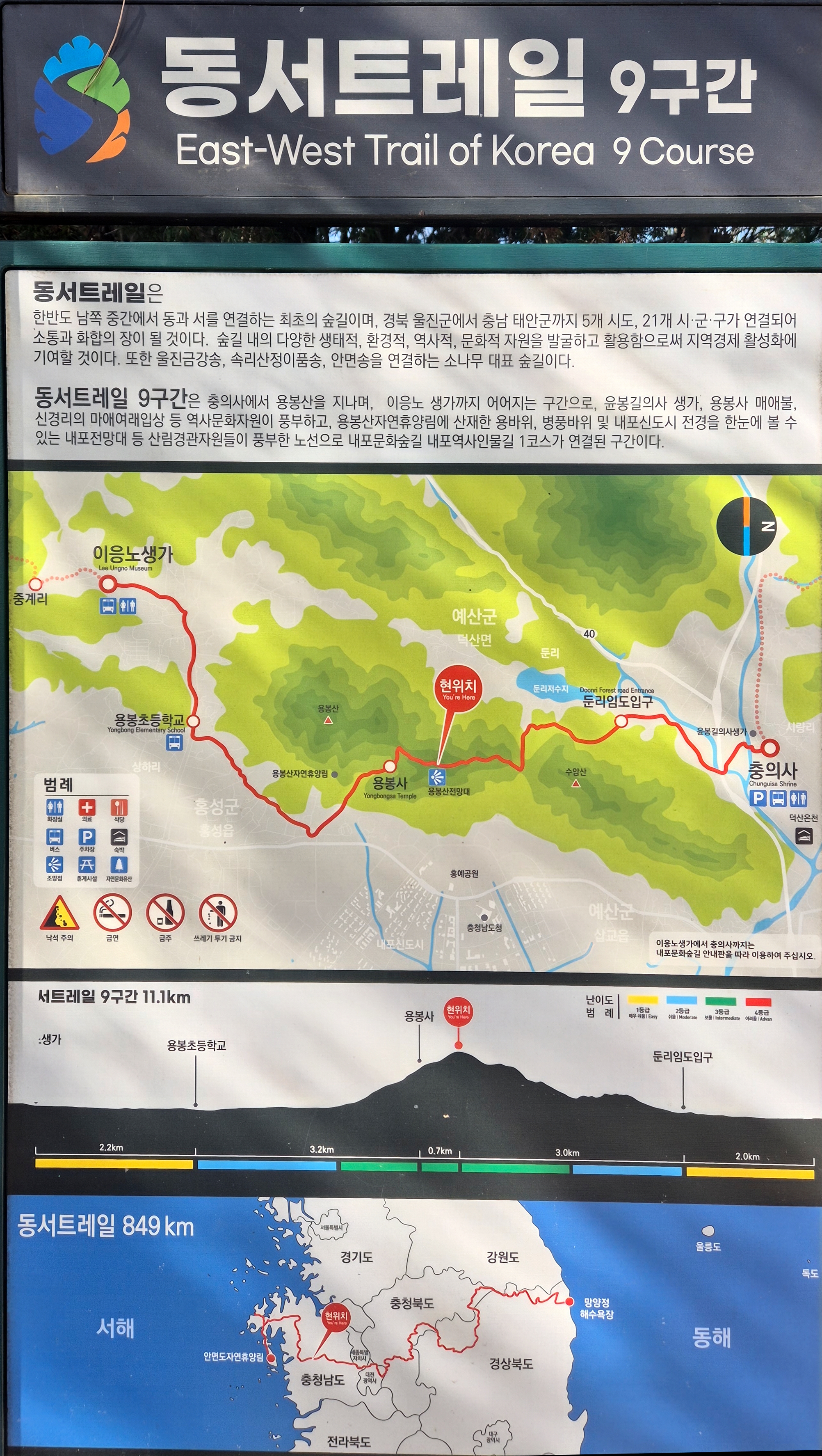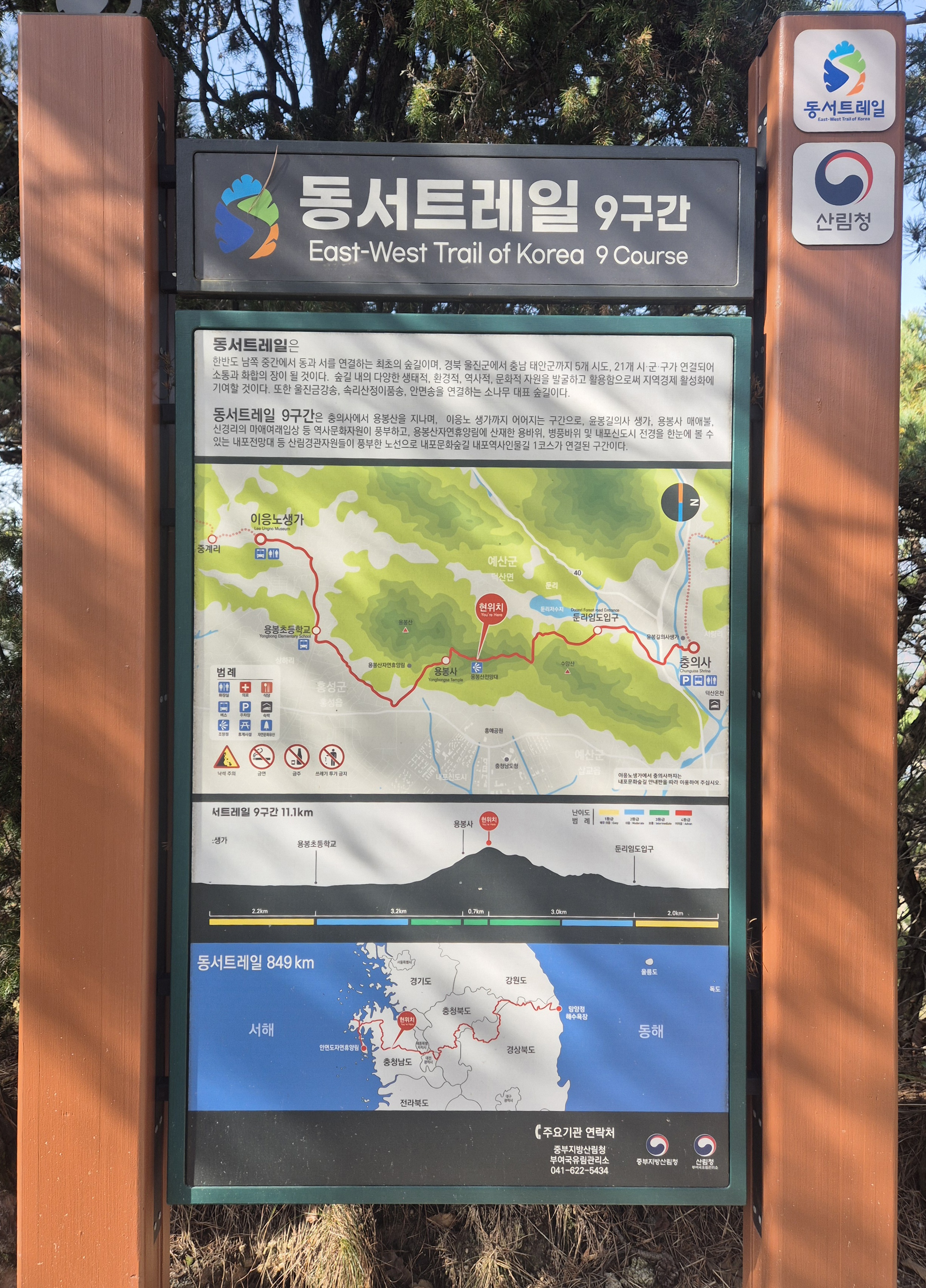 • 용봉산 산행으로 동서트레일 9구간 중 걷지 못한 구간 : 임간휴게소 - 용봉사 - 용봉사일주문 - 용봉산입구 - 하산마을 - 용봉산정보화마을 - 용봉초