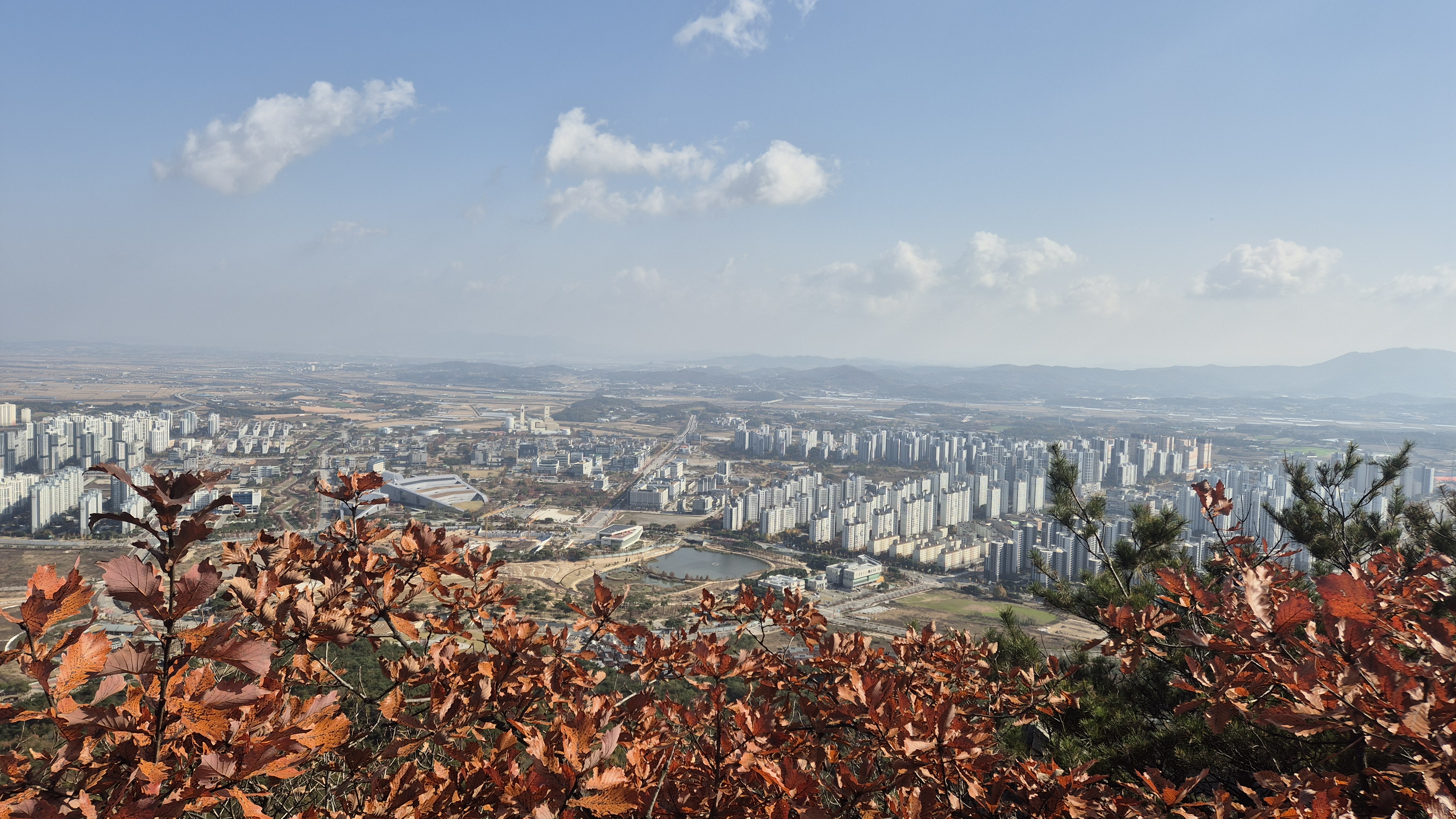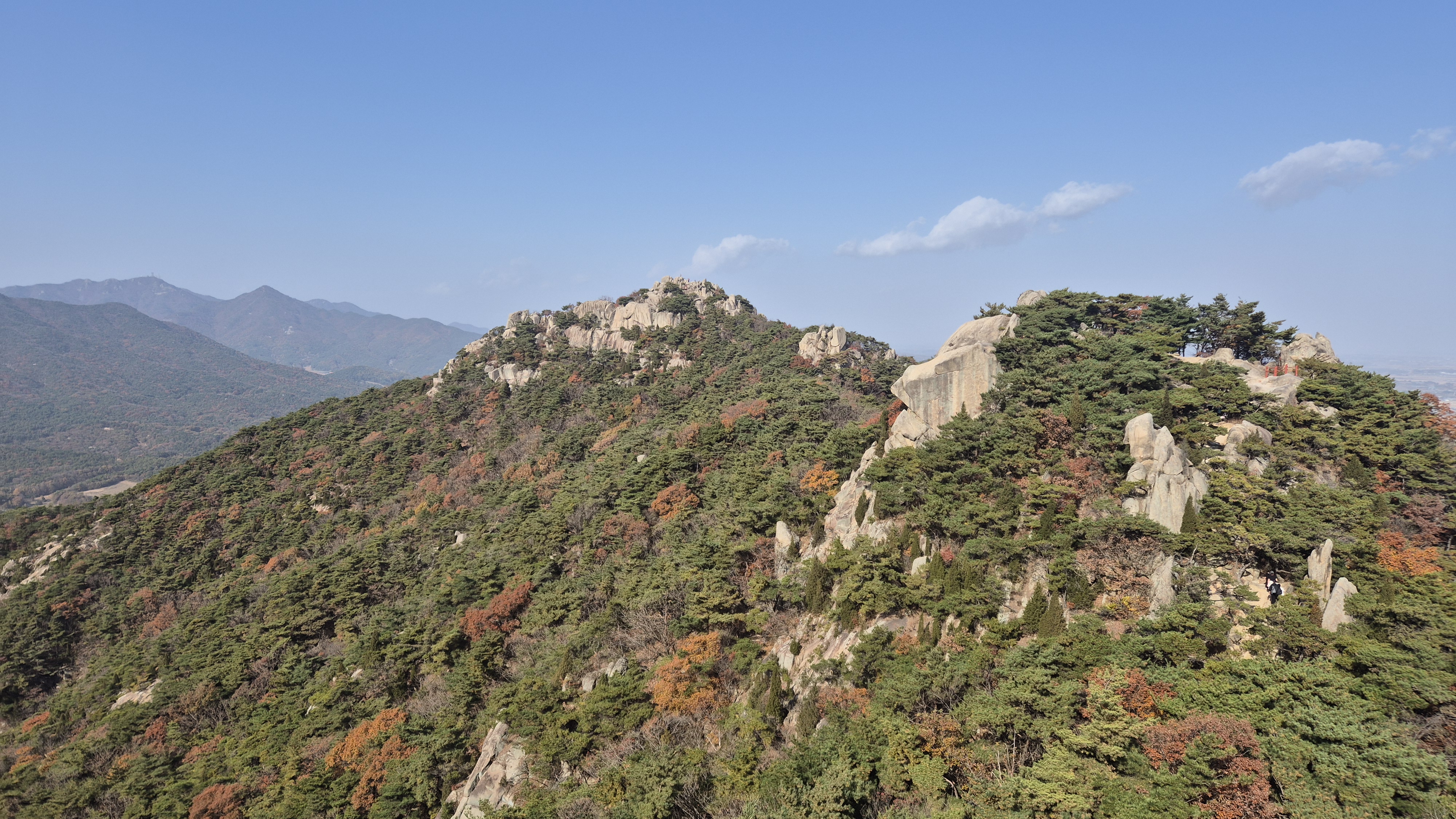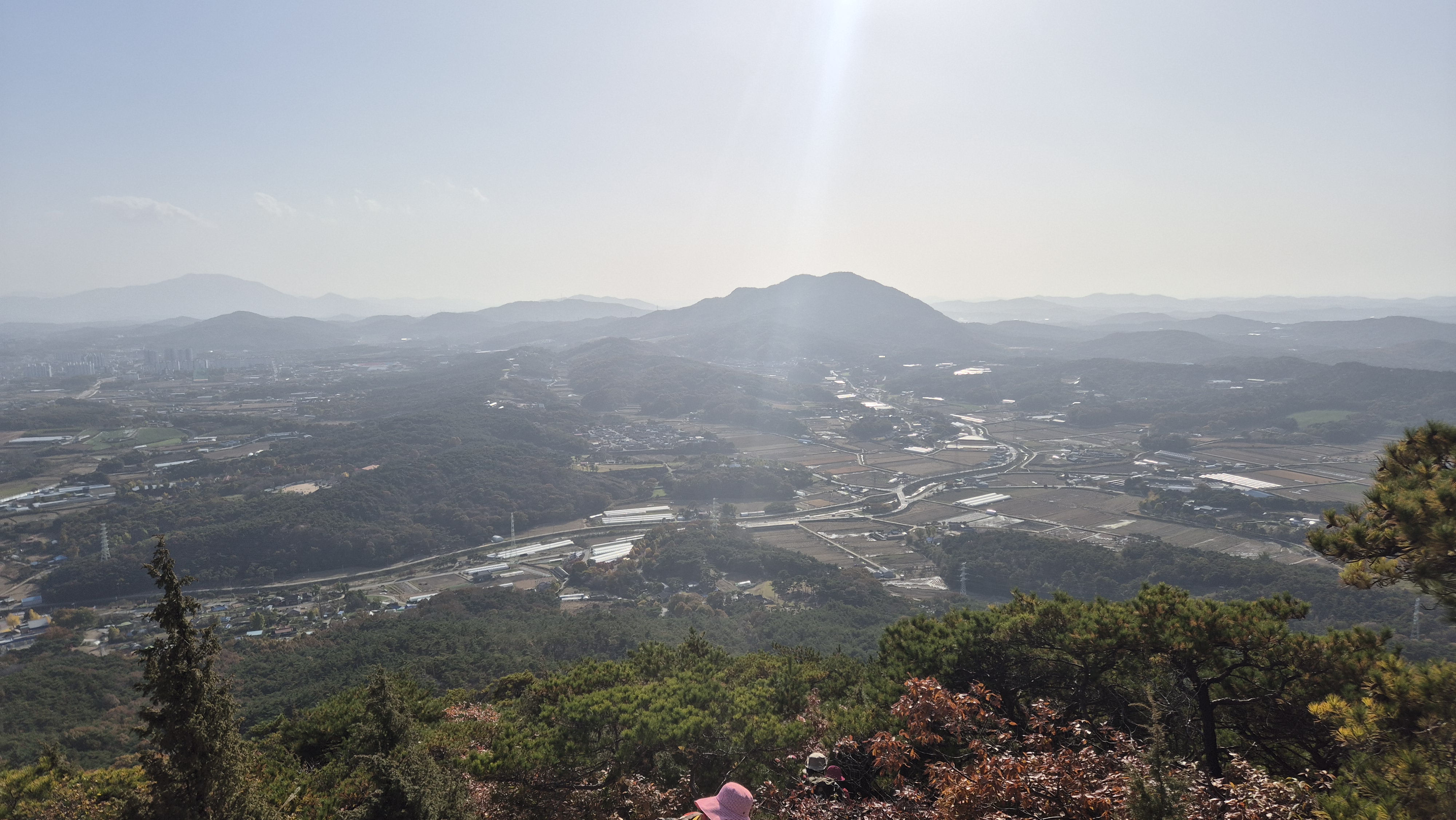 지나온 길을 조금 더 오른쪽으로 돌아보니 저기 하늘금엔 가야산군이 아련하다