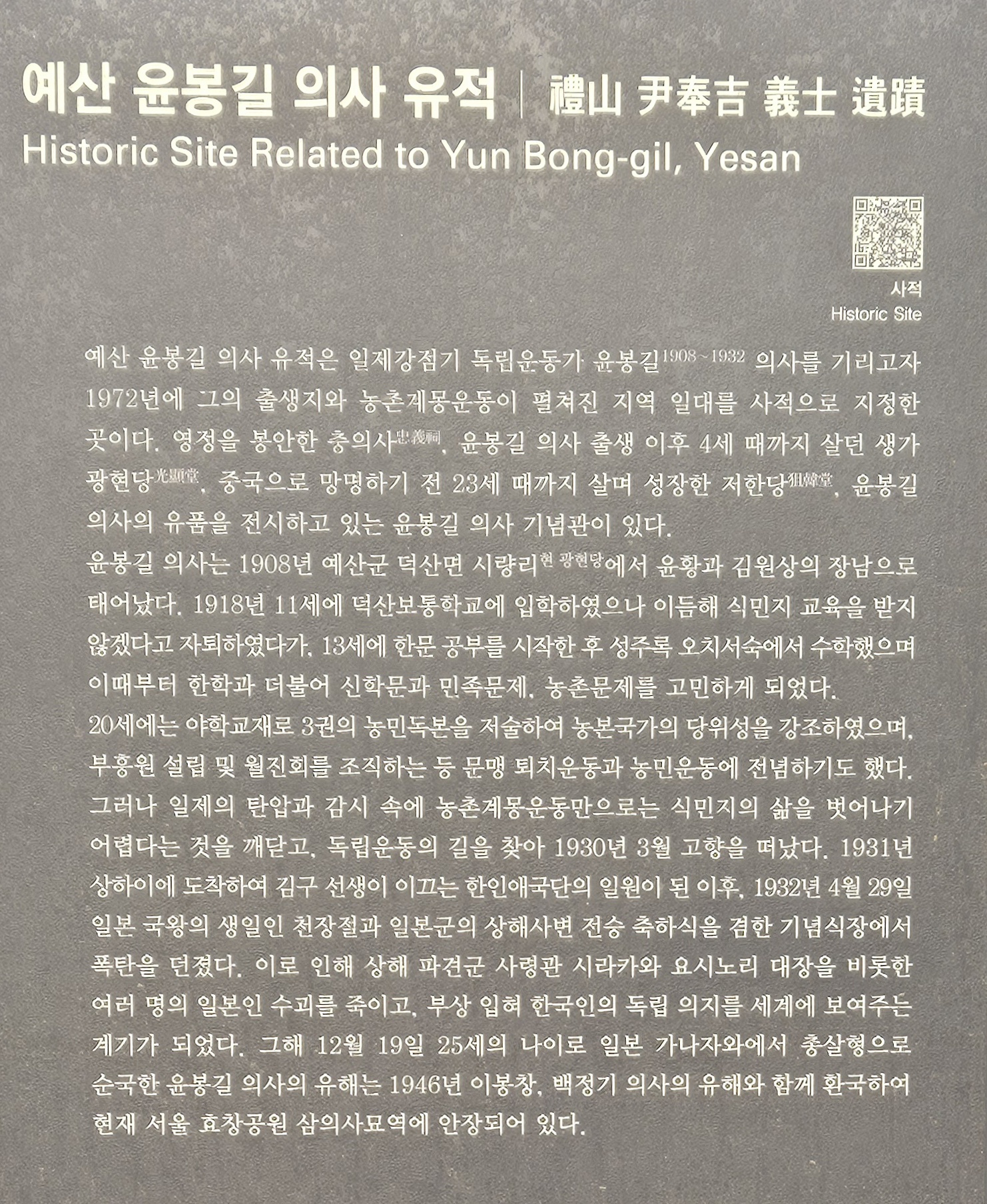 예산 윤봉길 의사 유적은 일제강점기 독립운동가 윤봉길(1908~1932) 의사를 기리고자 1972년 그의 출생지와 농촌계몽운동이 펼쳐진 지역 일대를 사적으로 지정한 곳이다. 영정을 봉안한 충의사, 윤봉길 의사 출생 이후 4세 때까지 살던 생가 광현당, 중국으로 망명하기 전 23세 때까지 살며 성장한 저한당, 윤봉길 의사 유품을 전시하고 있는 윤봉길 의사 기념관이 있다.