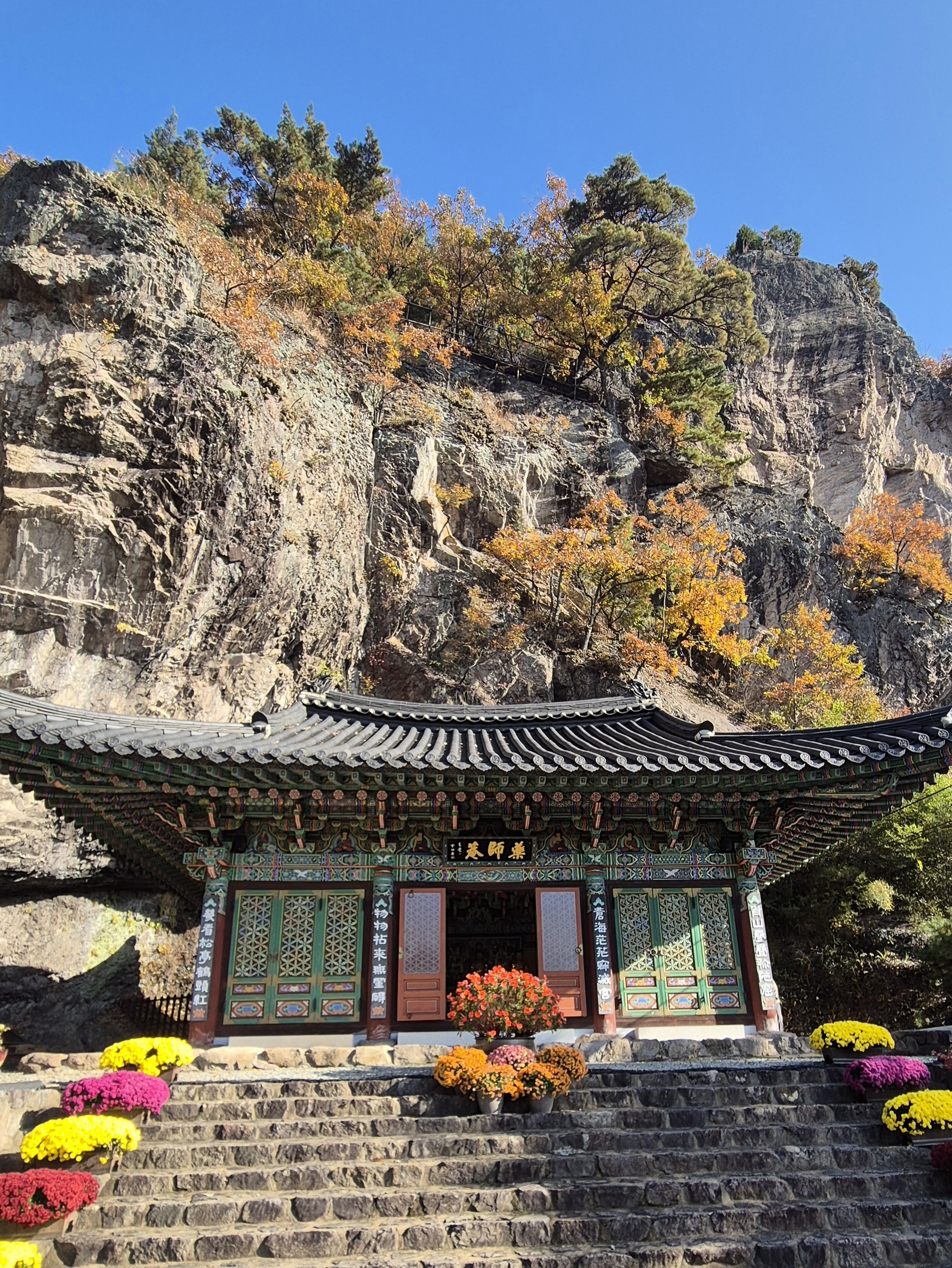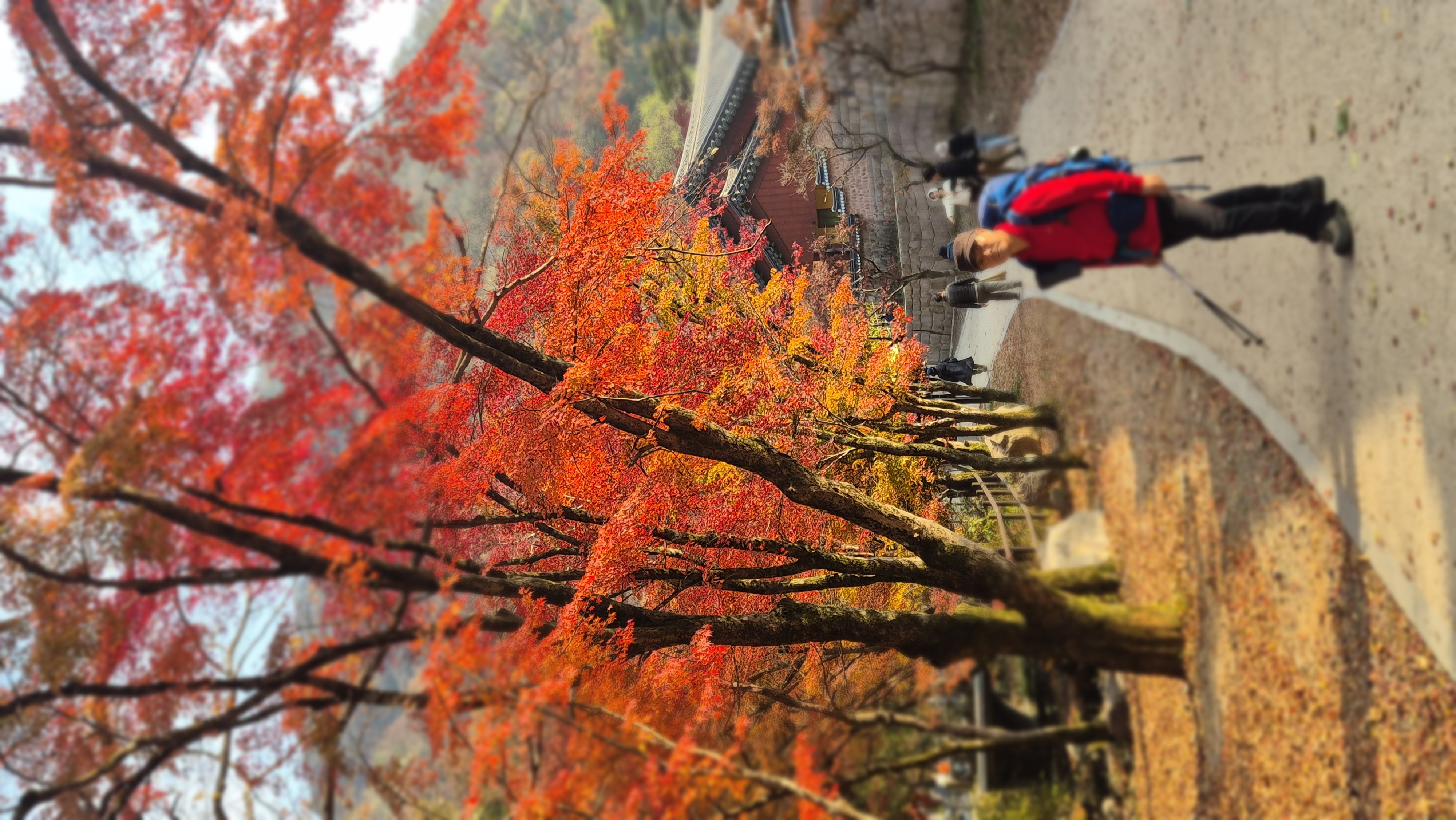 오전 햇살에 나부끼는 약사암 오름길 단풍이 환상이다.