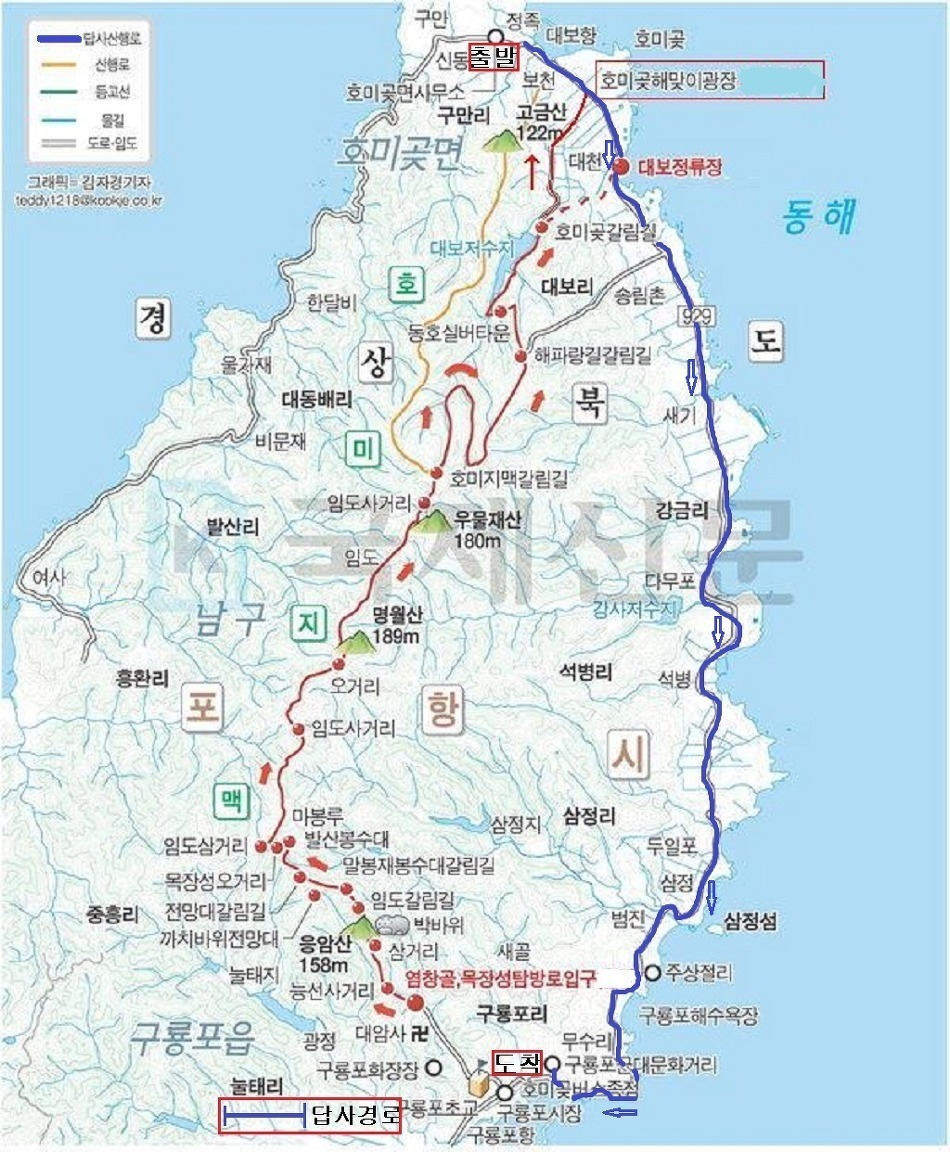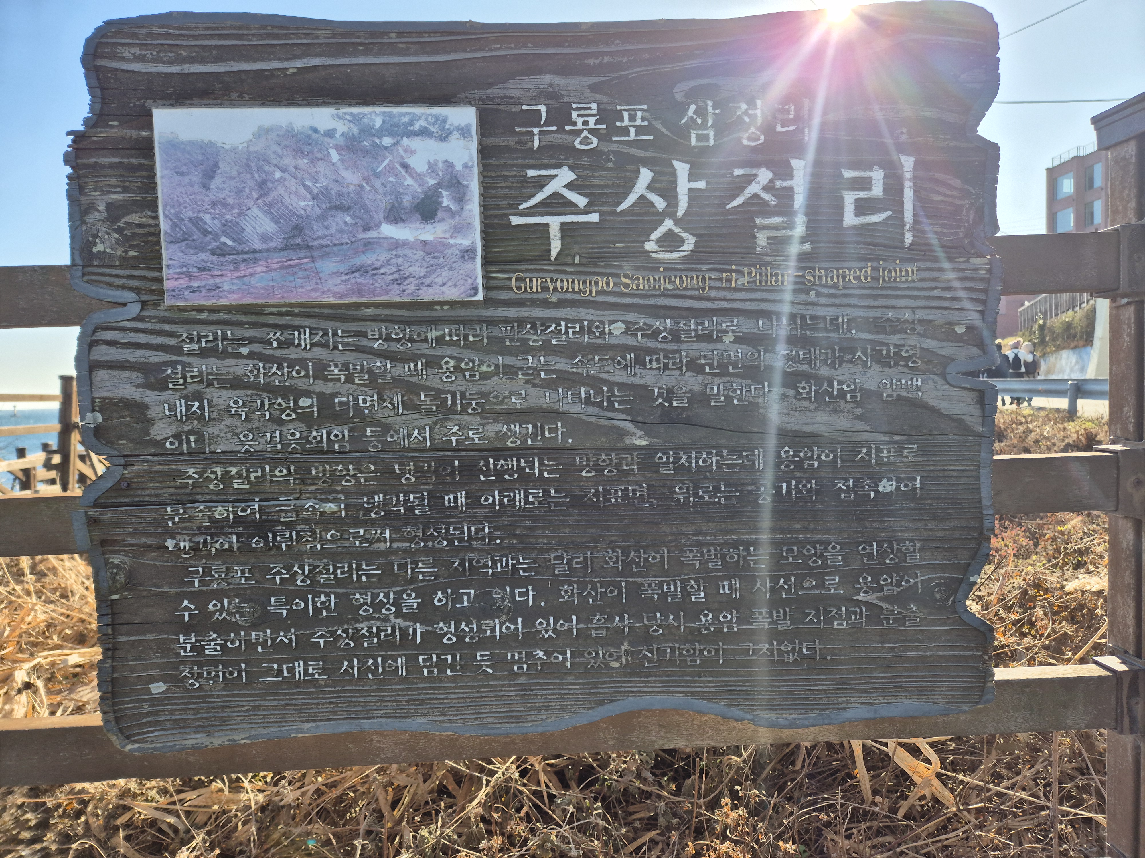 ○ 걸음 : 호미곶 해맞이광장 - 다무포 하얀고래마을 - 석병2리 - 한반도 동쪽땅끝공원 - 삼정섬 - 구룡포 주상절리 - 일본인가옥거리 - 구룡포항 공영주차장(구룡포파출소 지나 100m) : 15.3km