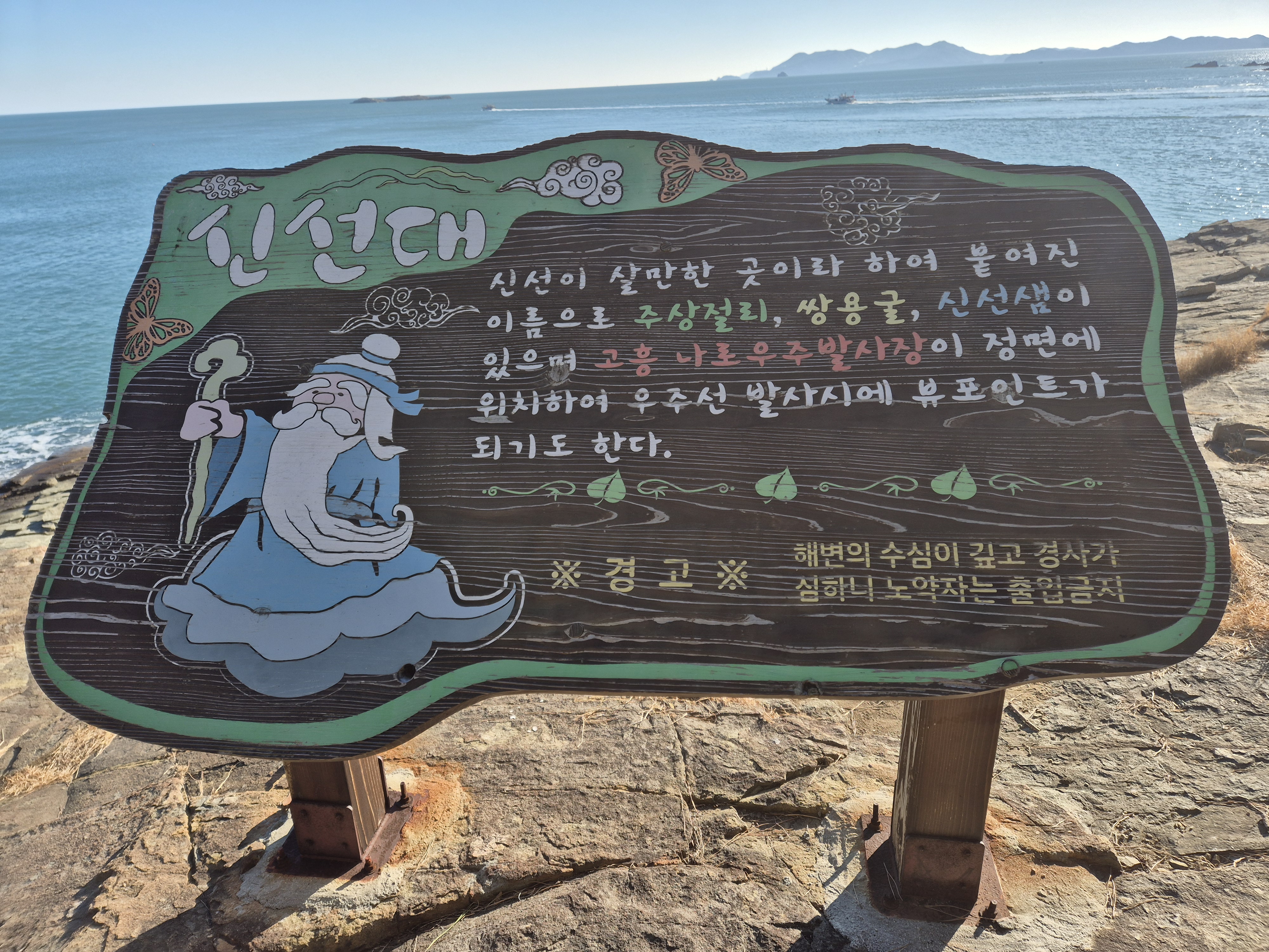 신선이 살만한 곳이라 하여 붙어진 이름으로 주상절리, 쌍용굴, 신선샘이 있으며 고흥 나로도우주발사장이 정면에 위치하여 우주선 발사 시에 뷰포인트가 되기도 한다.