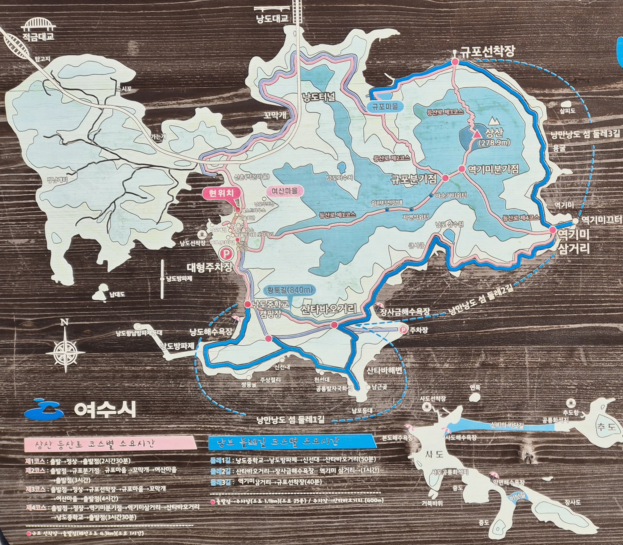 ○ 걸음 : 낭도 입구 주차장 - 낭도갱번미술관 - 젓샘막걸리 낭도주조장 - 낭도 선착장 - 낭도복지회관 - 등산로 제1코스 입구 - 규포분기점 - 역기미분기점 - 상산정상(278.9m) - 규포선착장 - 낭만 낭도 섬둘레길-역기미 삼거리 - 전망테크 - 장사금해수욕장 - 낭도포토존주차장 - 산타바해변 - 남포등대 - 천선대 - 신선대 - 주상절리 - 낭도해수욕장 - 낭도 선착장 - 낭도입구주차장 원점회귀 (12km)