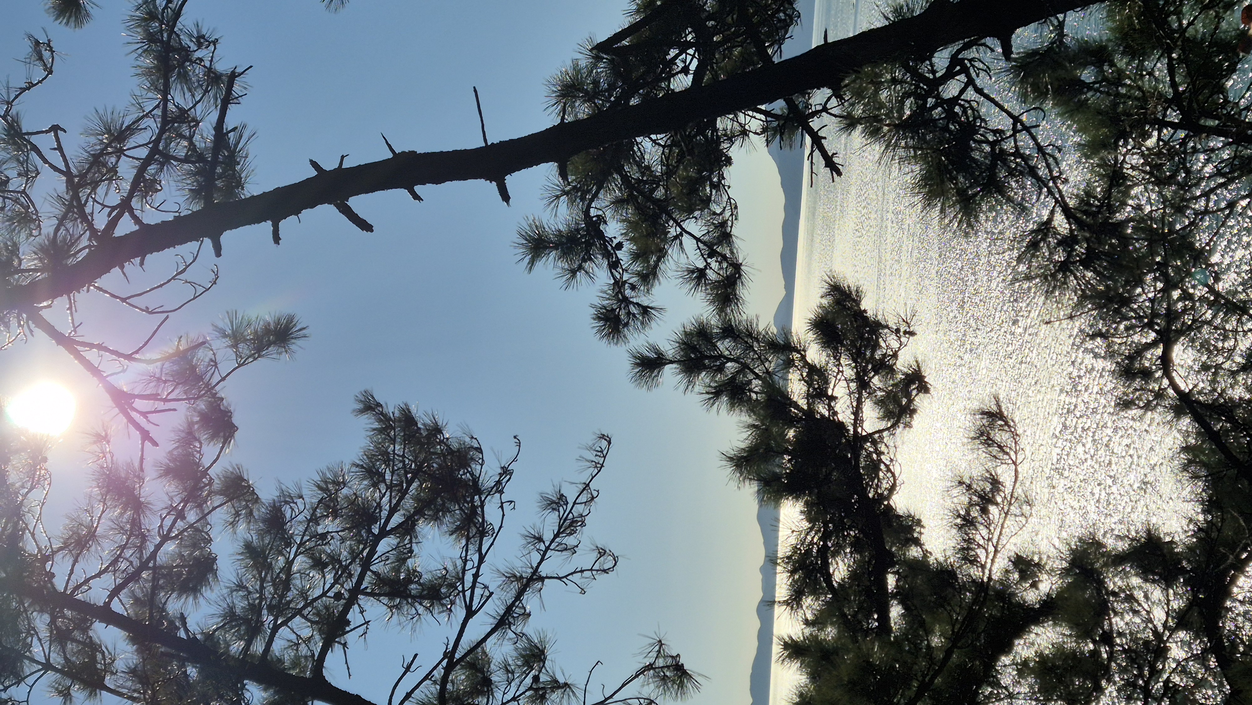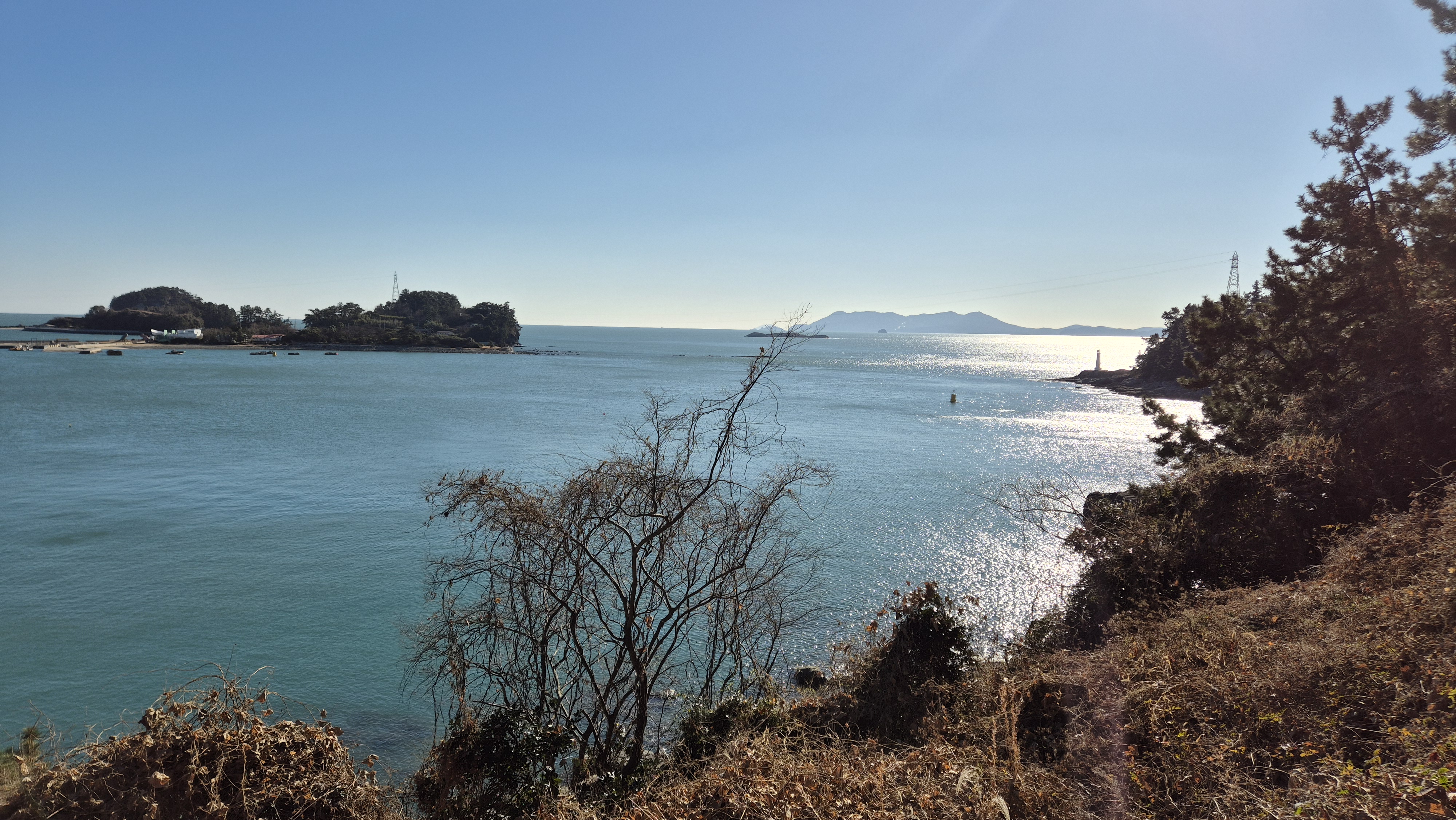 해송 솔가지 사이로 빛나는 남해 윤슬