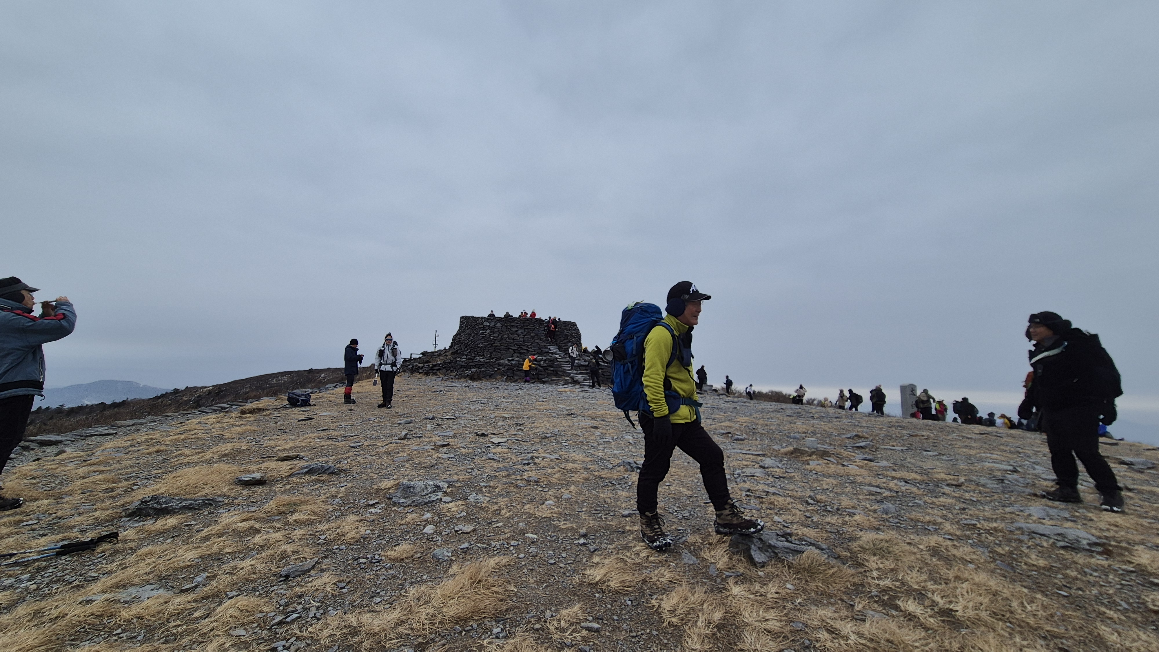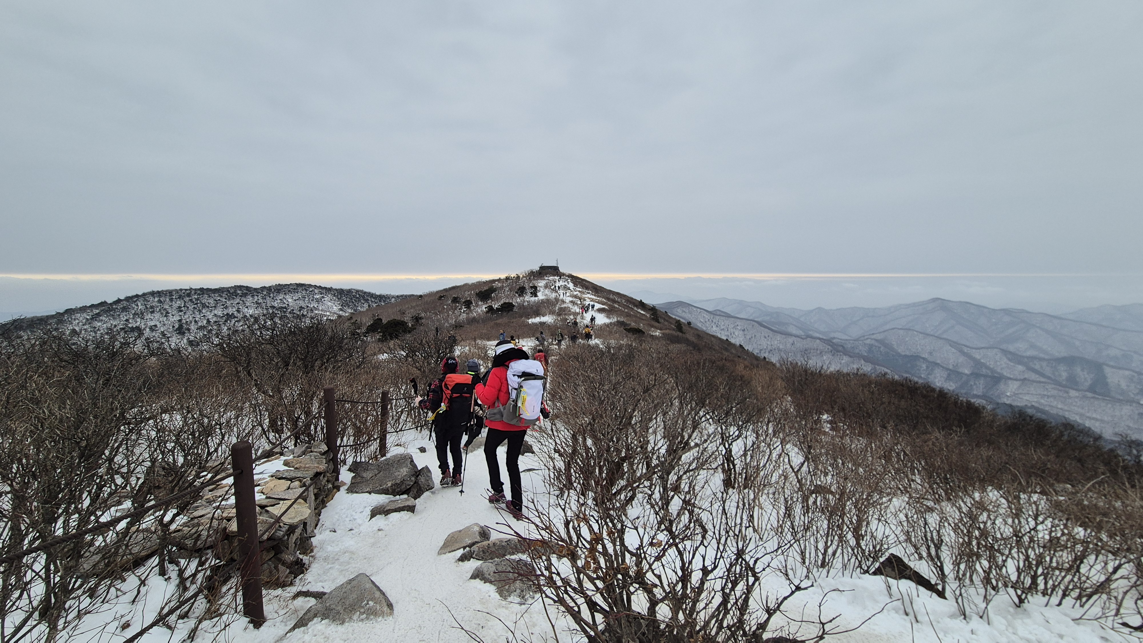 저기 천왕단으로 가는 능선길이 환상이다. 예전 같으면 하얀 눈으로 덮인 환상의 길에 불어오는 칼바람을 헤치며 걷는 추억이 깊은 매력이지만 오늘은 눈도 없고 칼바람도 불지 않는다.