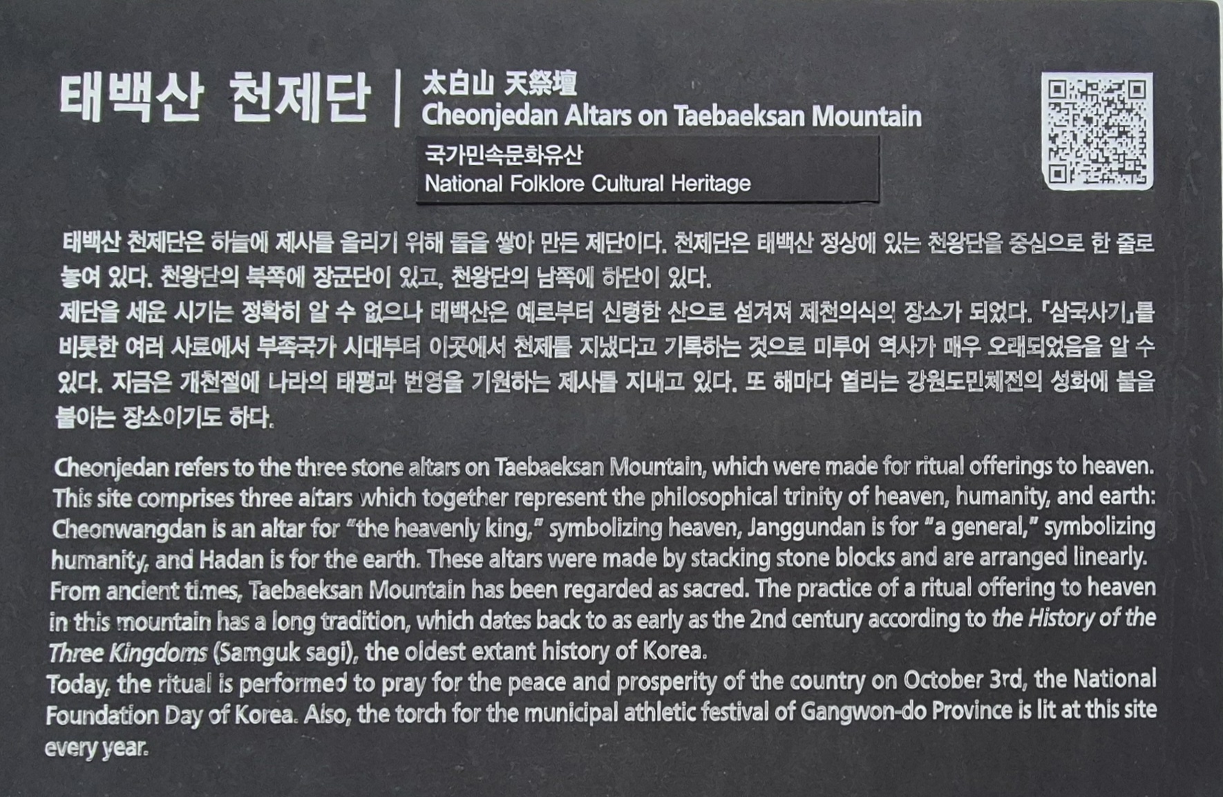오늘날 10월 3일 개천절에 하늘에 제사를 이곳 태백산 천제단에서 지내는 것은 그러한 의미를 담고 있다. 남북이 통일이 된다면 어쩌면 10월 3일 개천절에 백두산에서 하늘에 제사를 지낼지도 모른다.