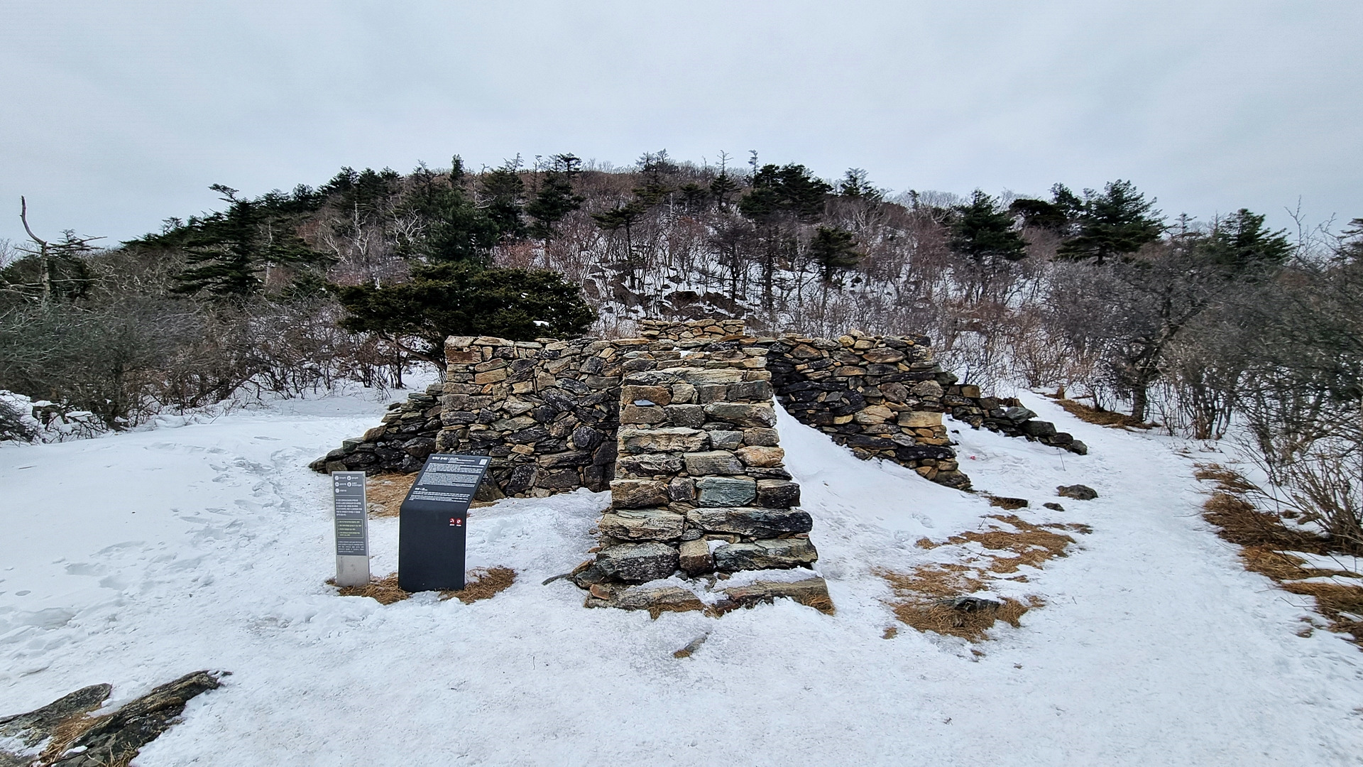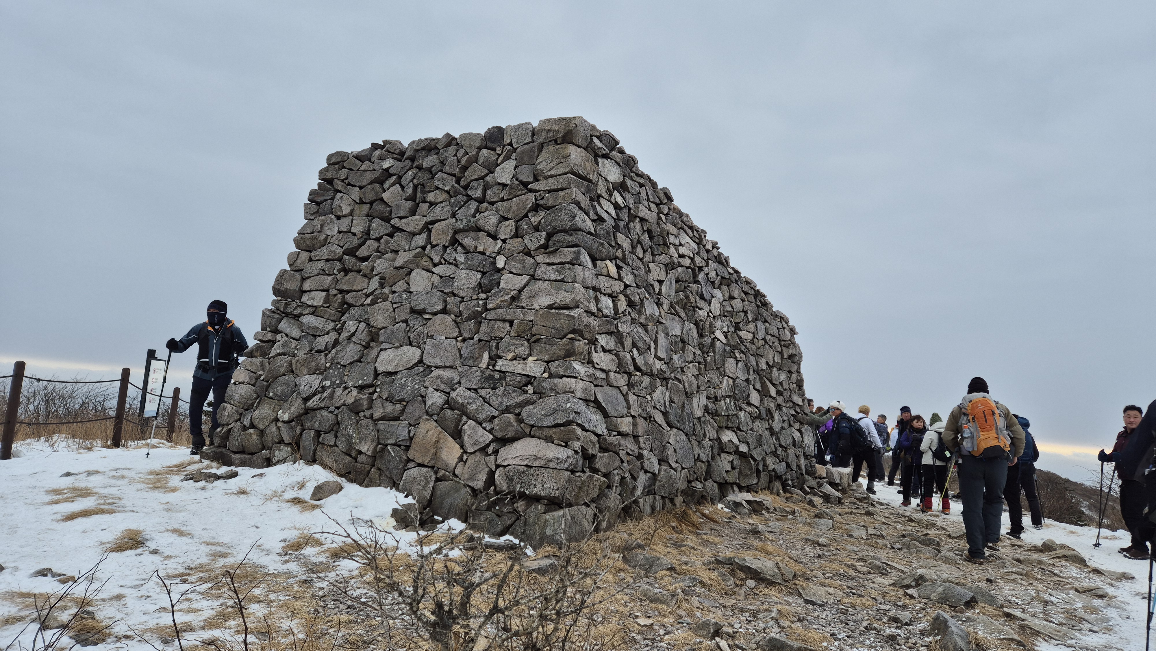 아주 오래전에 태백산을 처음 오르고 이 길로 하산할 때 저기 호식총을 보았다. 그때는 시루가 덮어 있었고 시루 가운데에 가락이 꽂혀 있었다. 그다음 상당한 시간이 흐른 뒤 다시 이 길을 걸을 때는 시루는 없고 돌탑만 쌓여 있었다. 오늘은 흰 눈이 덮여 있어 흔적만 보고 간다.
