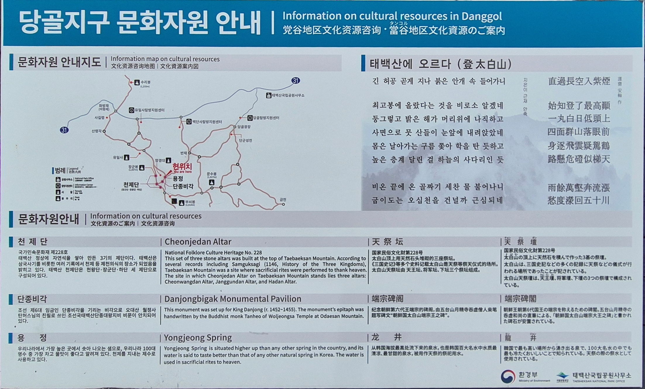 그렇다 하더라도 이곳 강원도 태백산은 하늘의 뜻인 홍익인간 세상을 실현한 숭고한 정신을 기리는 천제단이 있어 민족의 성스런 산으로 여겨 마땅하지 않은가?