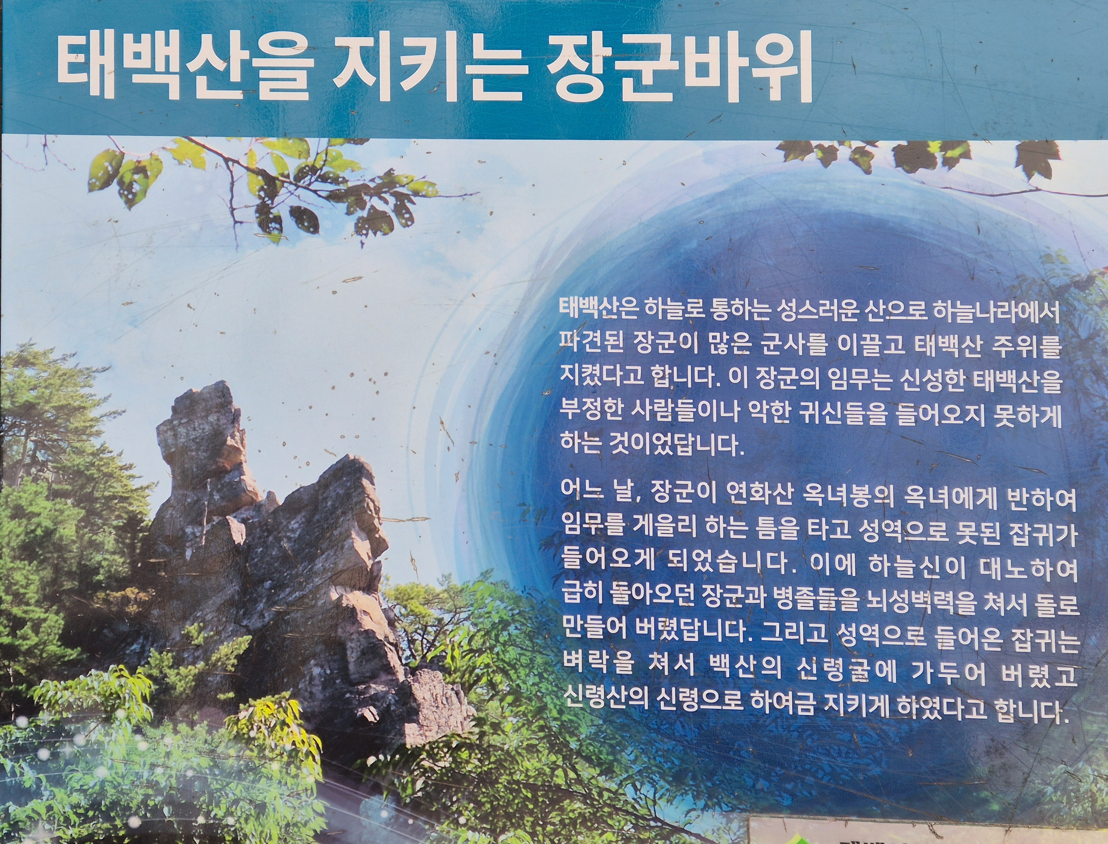 태백산은 하늘로 통하는 성스러운 산으로 나라에서 파견된 장군이 많은 군사를 이끌고 태백산 주위를 지켰다고 한다. 이 장군의 임무는 신성한 태백산을 부정한 사람들이나 악한 귀신들을 들어오지 못하게 하는 것이었다.