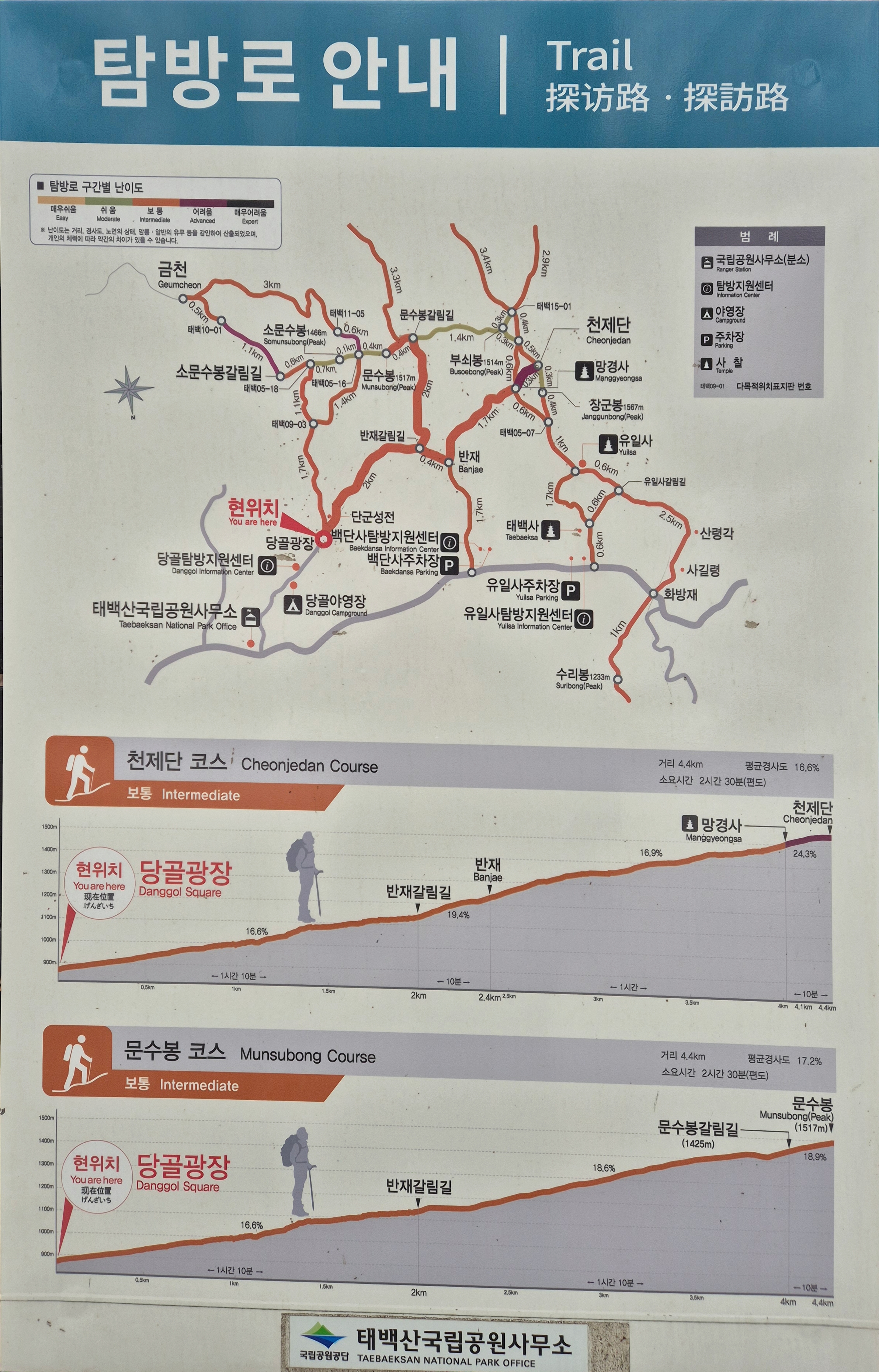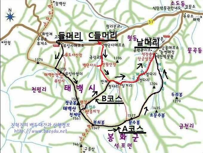 ○ 걸음 : 유일사매표소 - 유일사 쉼터 갈림길 - 주목군락지 - 장군봉 - 천제단 - 단종비각 - 망경사 - 반재 - 장군바위 - 단군성전 - 당골