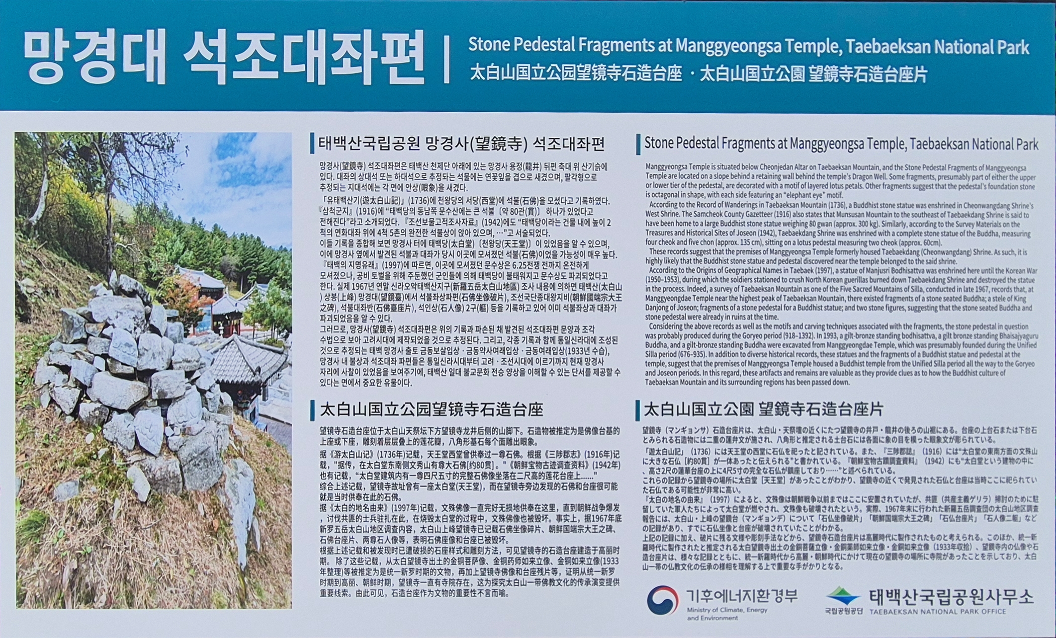 실제 1967년 연말 신라오악태백산지구 조사 내용에 의하면 태백산 상봉 망경대에서 석불좌상파편, 조선국단종대왕지비, 석불대좌반, 석인상 2구 등을 기록하고 있어 이미 석불좌상과 대좌가 파괴되었음을 알 수 있다.