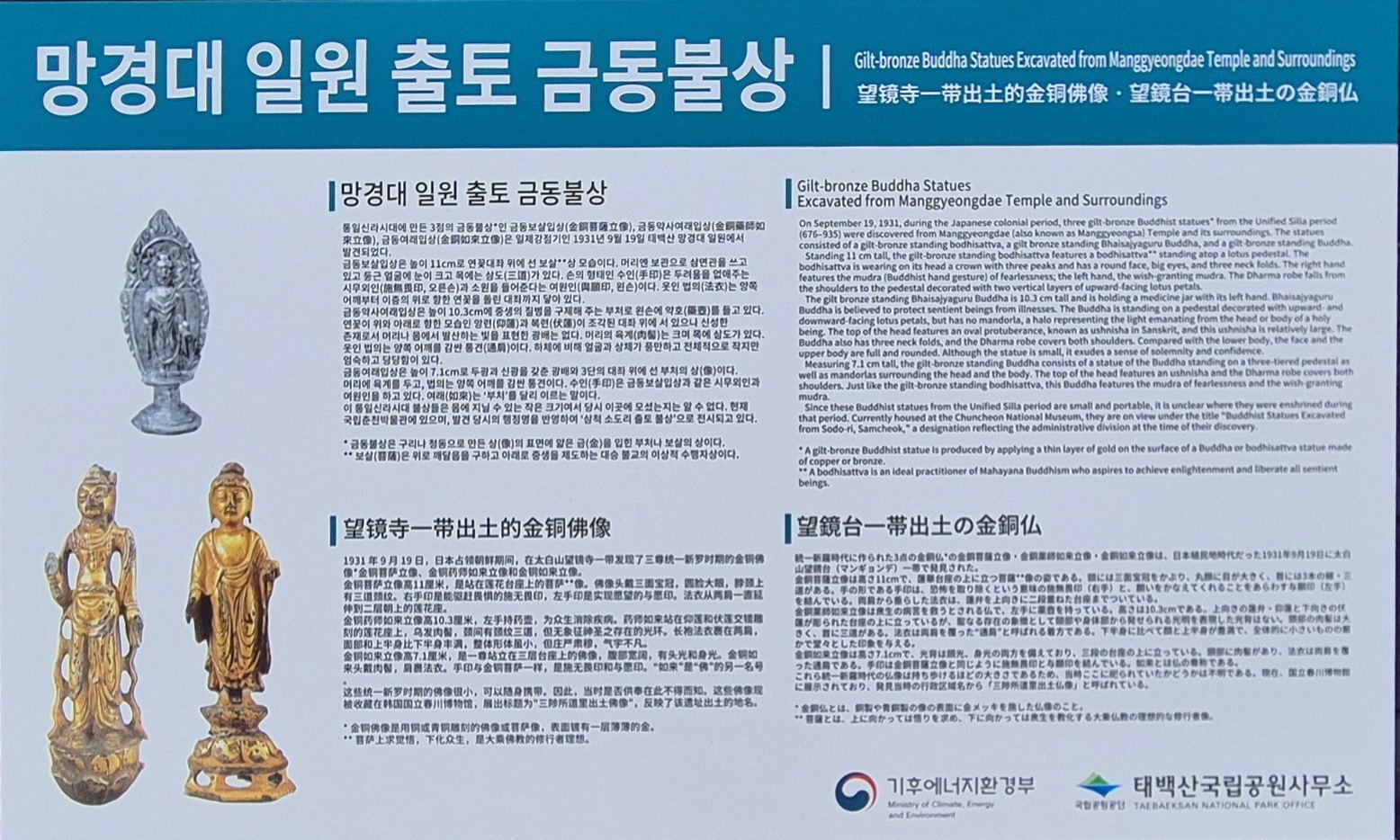 통일신라시대에 만든 3점의 금동불상인 금동보살입상, 금동약사여래입상, 금동여래입상은 일제강점기인 1931년 9월 19일 태백산 망경대 일원에서 발견되었다.