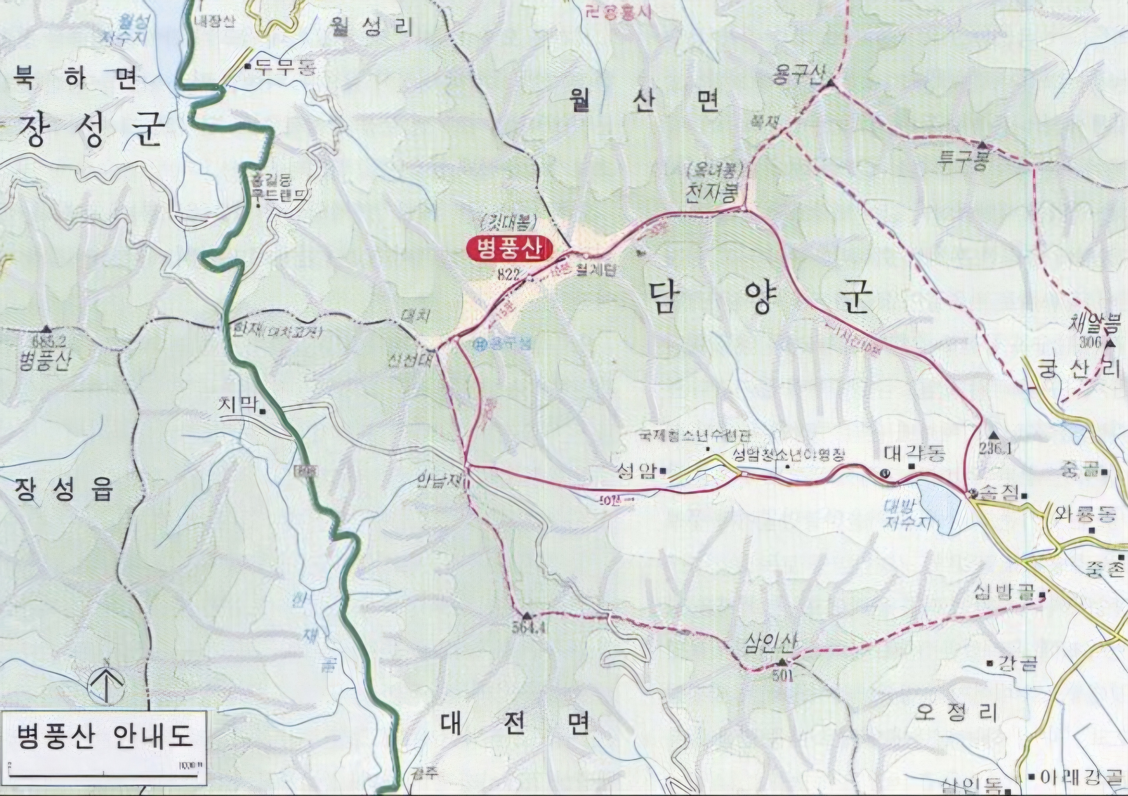 대방저수지 - 천자봉 - 병풍산 - 투구봉 - 만남재 - 성암야영장 - 대방저수지(원점회귀) 코스이다.