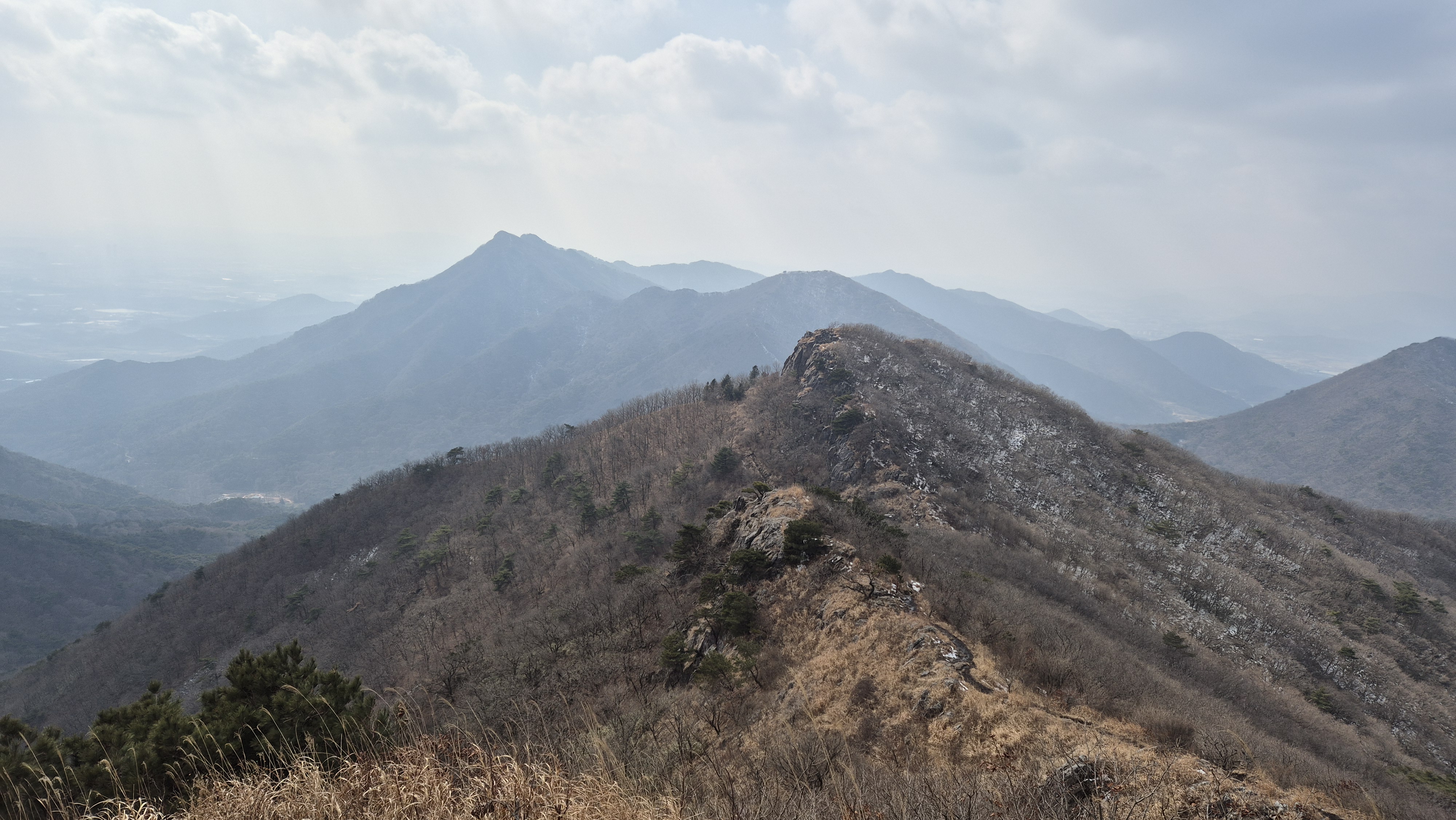 천자봉 조망처에 섰다. 가야 할 병풍산 줄기와 저기 하늘금에 살짝 얼굴을 내민 불태산 줄기가 장쾌하다.